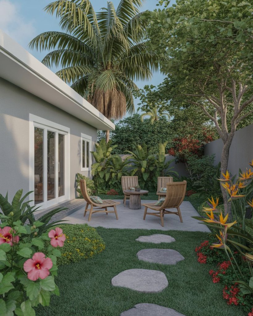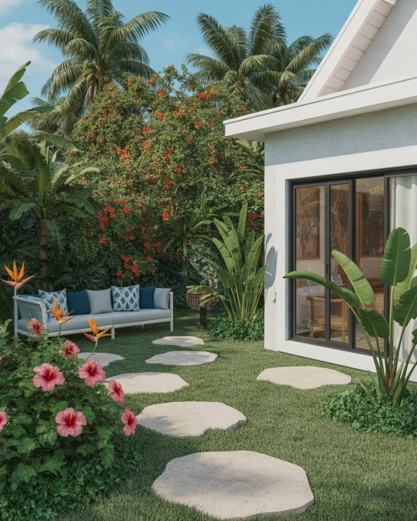 Bring the warmth of the tropics into your backyard with bold foliage, hibiscus, and bird of paradise plants. The aesthetic here is lush and vibrant, filled with texture and color. Add potted palms and colorful accents inspired by Animal Crossing island vibes for that eternal vacation feeling.