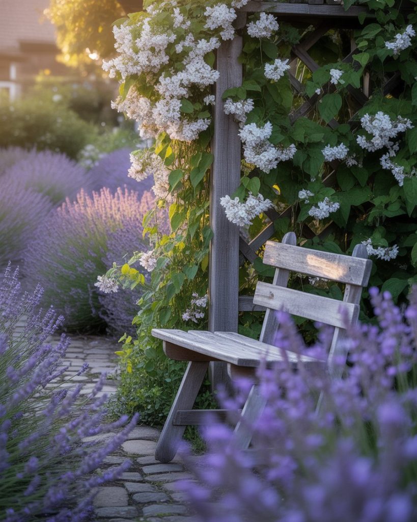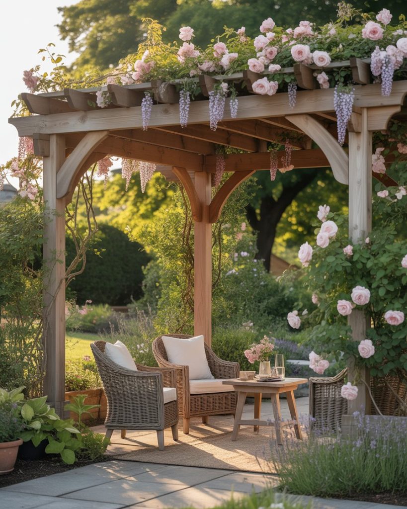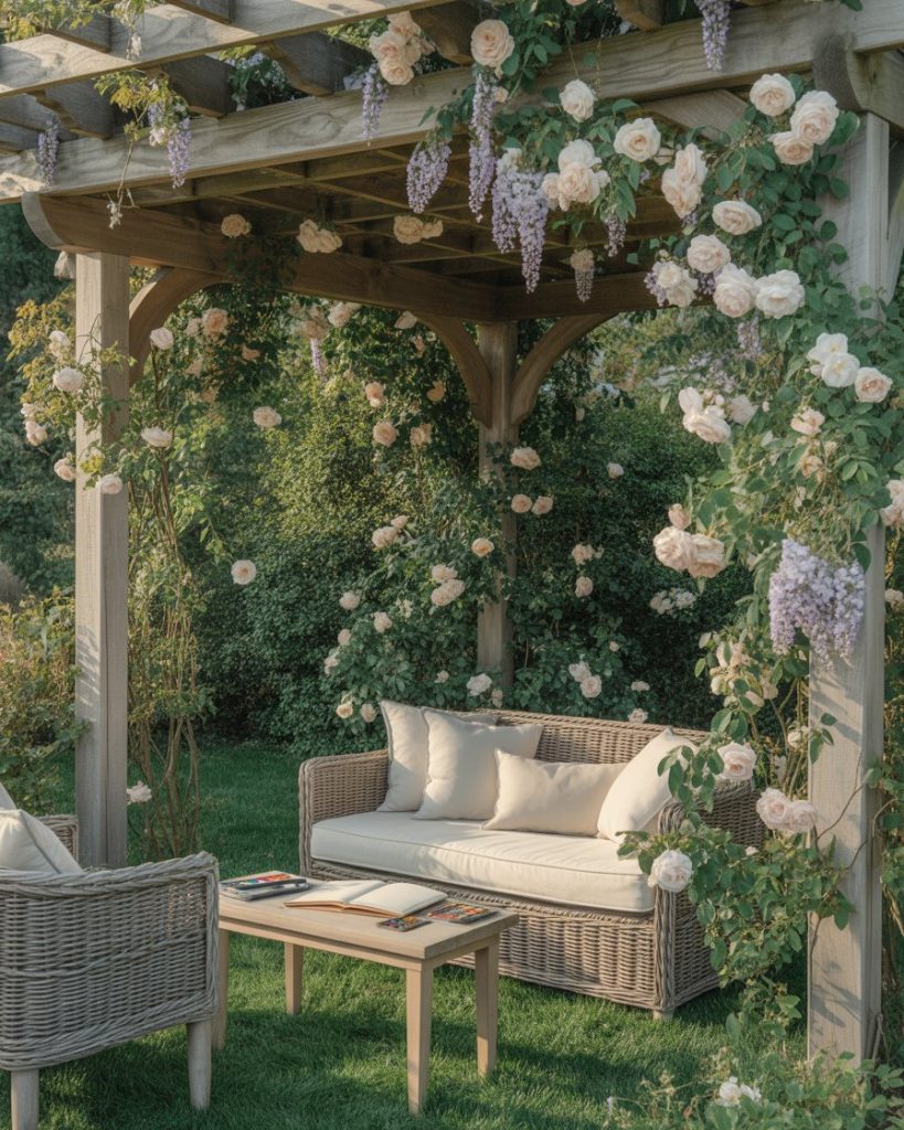 Add structure with a wooden pergola wrapped in climbing roses or wisteria. Beneath, set up cozy seating for drawing, reading, or tea. This romantic design brings function and fragrance together, offering a dreamy backyard escape filled with inspiration.
