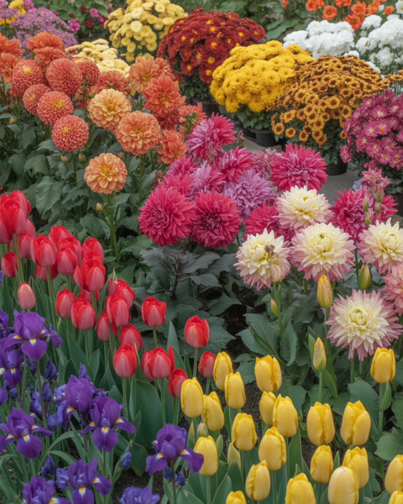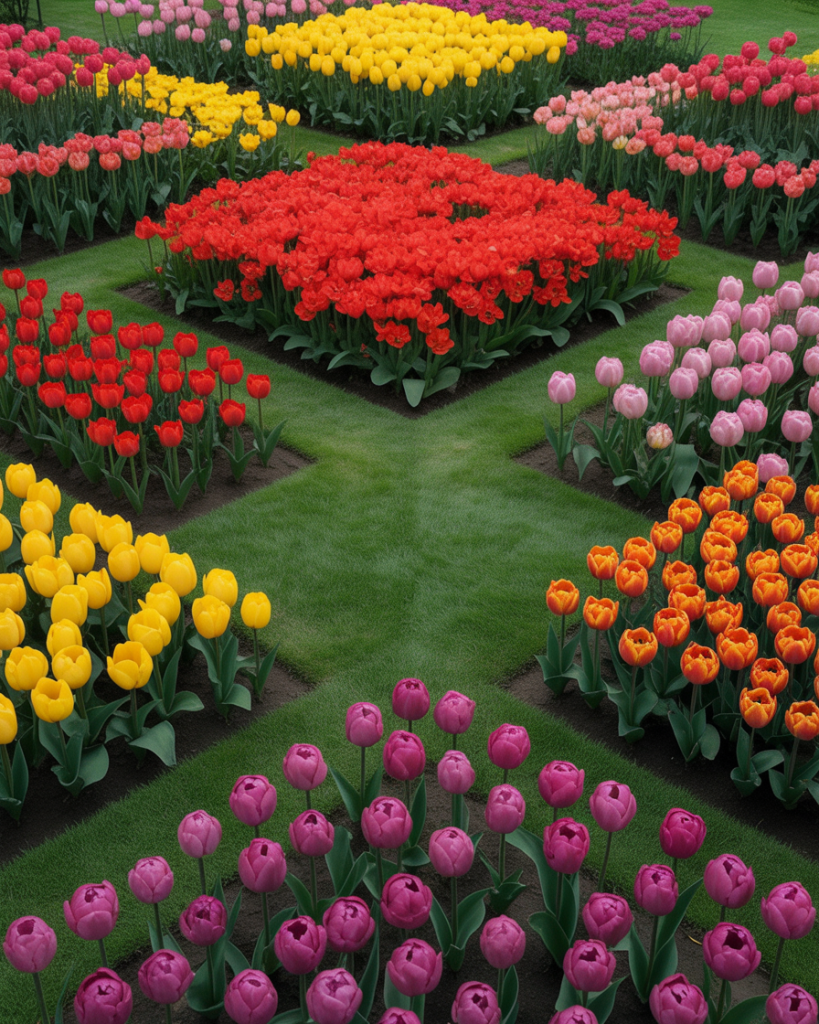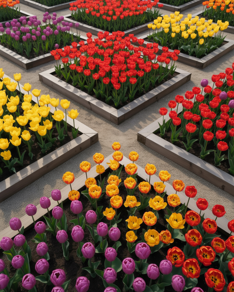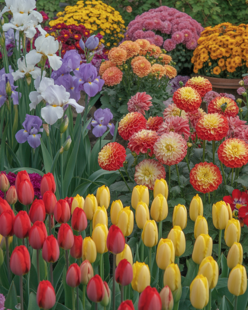 Plan your layout to bloom through the year — tulips and Iris in spring, Dahlia in summer, and chrysanthemums in fall. This dynamic design keeps your garden beautiful across all seasons, like a rotating outdoor painting of colors and moods.