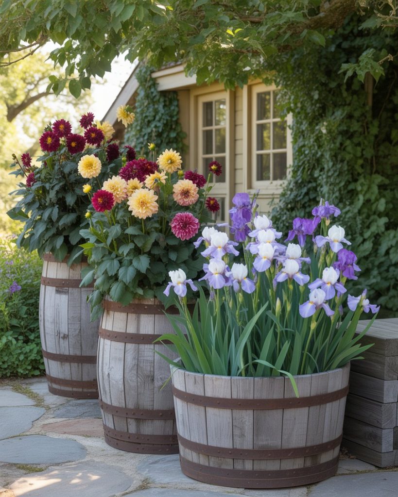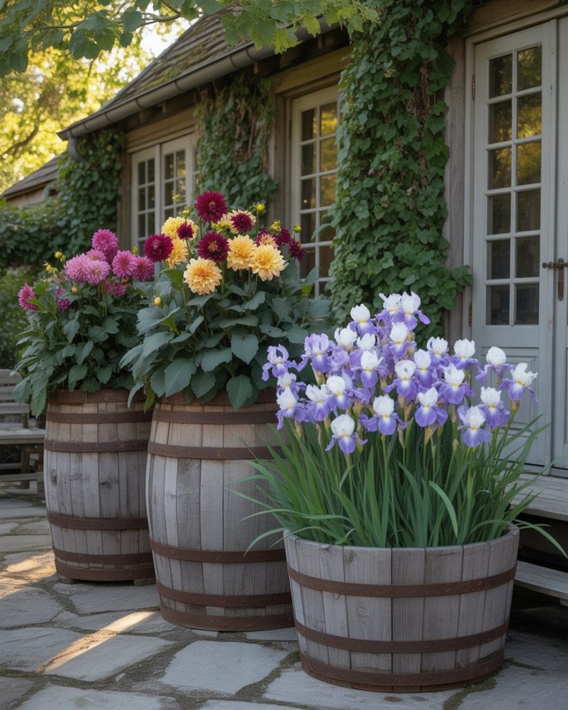 Repurposing wooden barrels or crates adds countryside charm. Fill them with cascading Iris, Dahlia, or herbs for texture and fragrance. This cottage-style design works perfectly in front of house or patio corners, blending rustic aesthetics with cozy home appeal.