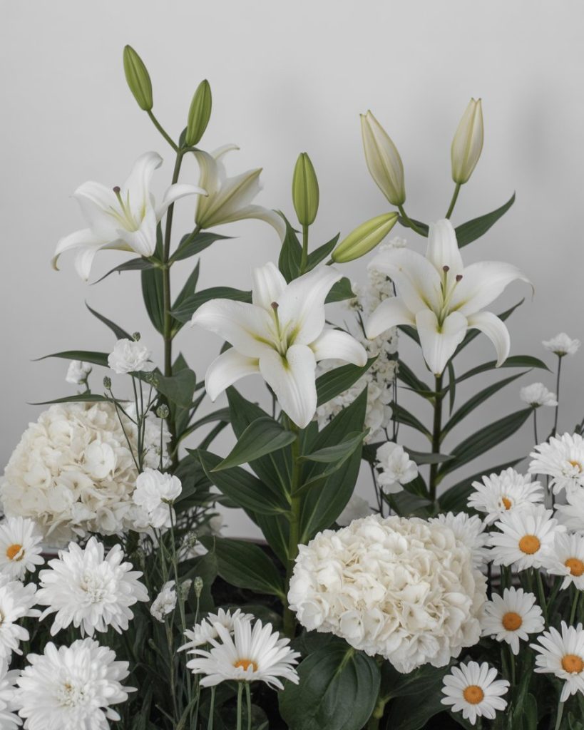 Sometimes less is more — choose one dominant color and commit to it. A beautiful all-white layout with lilies, hydrangeas, and daisies exudes timeless elegance. This aesthetic fits modern home designs, emphasizing purity and light reflection, like a living painting of calm.