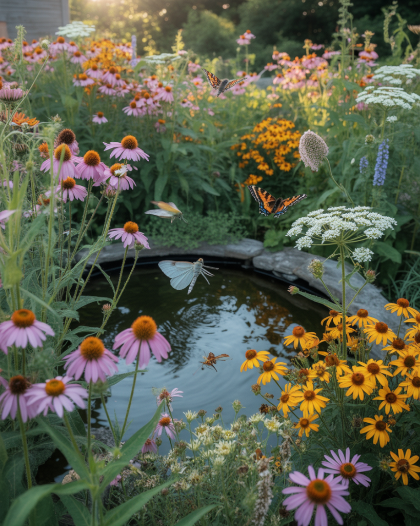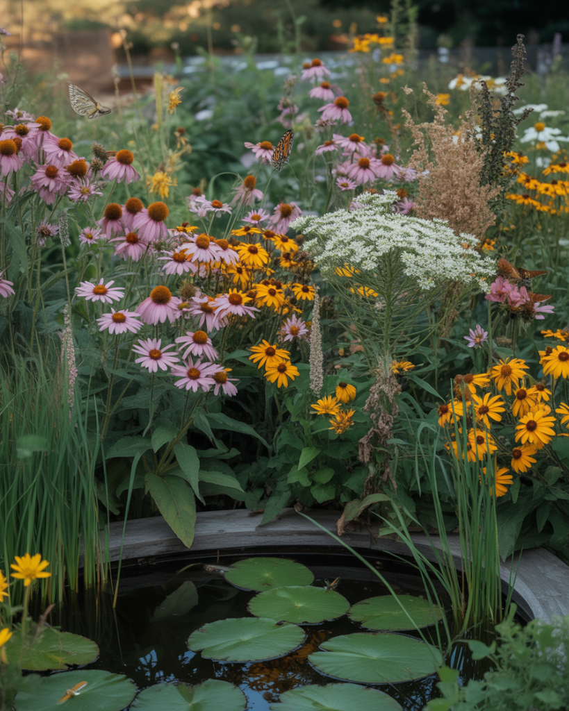 This idea combines beauty and purpose. Use native flowers, tall grasses, and wild herbs to attract bees, butterflies, and birds. A small pond or birdbath enhances the natural balance. It’s a living illustration of sustainability and inspiration for eco-conscious gardeners.