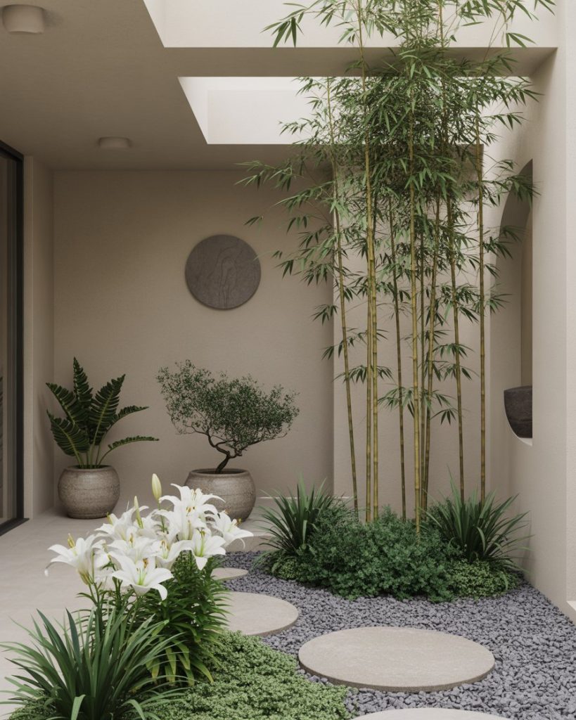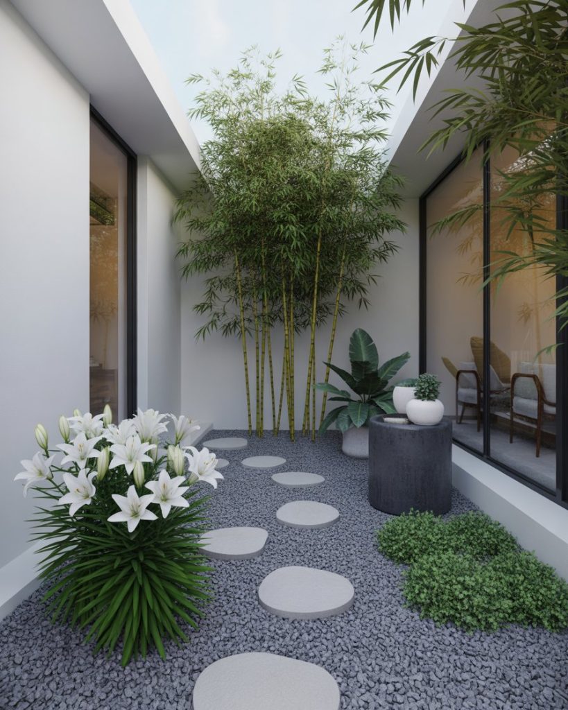 For those who find peace in simplicity, a minimalist layout using clean lines, potted plants, and soft neutrals provides calm balance. Inspired by Japanese design, this approach focuses on space, not clutter. Iris or white lilies in sleek containers make striking focal points. The background remains serene — think gravel, bamboo, and stone. This style is ideal for modern home courtyards.