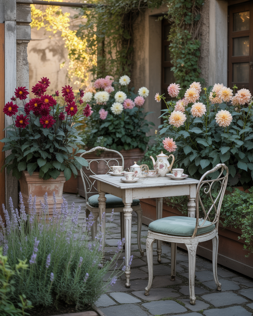 Inspired by old-world charm, this idea blends cottage flowers, potted arrangements, and antique furniture. Pair Dahlia, lavender, and Iris with lace tablecloths and vintage teapots for a nostalgic aesthetic that feels like stepping into a fairytale afternoon.