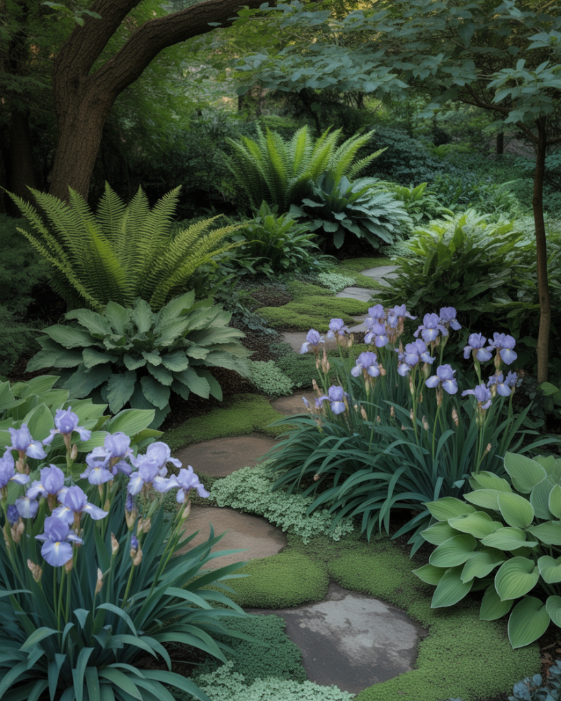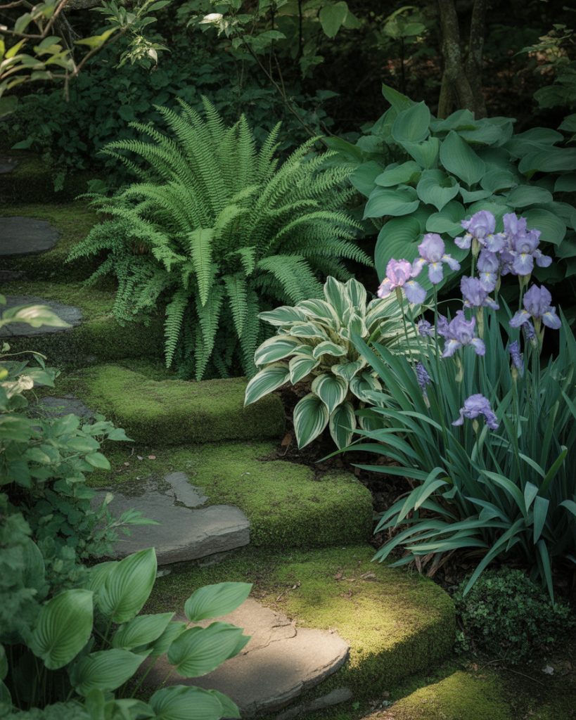 If your home has less sunlight, lean into it with ferns, hostas, and shade-loving Iris. Add stone pathways and moss accents for an enchanted forest feel. This layout creates a calm, beautiful refuge that feels both mysterious and alive with natural inspiration.