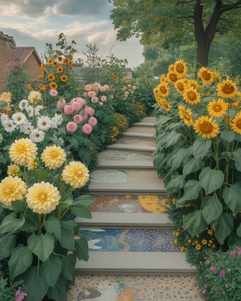 Take a page from Gustav Klimt’s golden tones — use yellow Dahlia, marigolds, and sunflowers to craft a vibrant, artful background. This painterly approach turns your garden into a living painting, especially when paired with gold accents or mosaic pathways. It’s where illustration meets landscape — a masterpiece under the open sky.