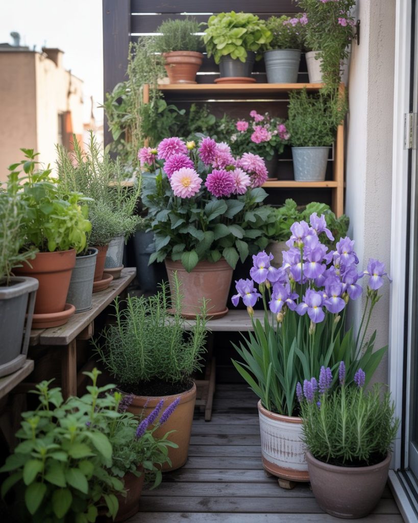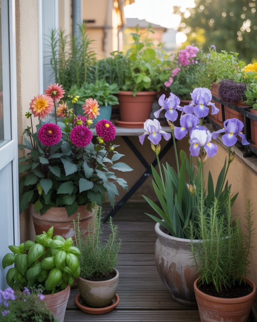 Not everyone has a backyard — but you can still enjoy floral beauty through a potted garden on your balcony. Group containers with petunias, Iris, or miniature Dahlia to create vertical layers of color. Add herbs or succulents for texture contrast. This design works especially well for apartments seeking a vibrant yet cozy home sanctuary.