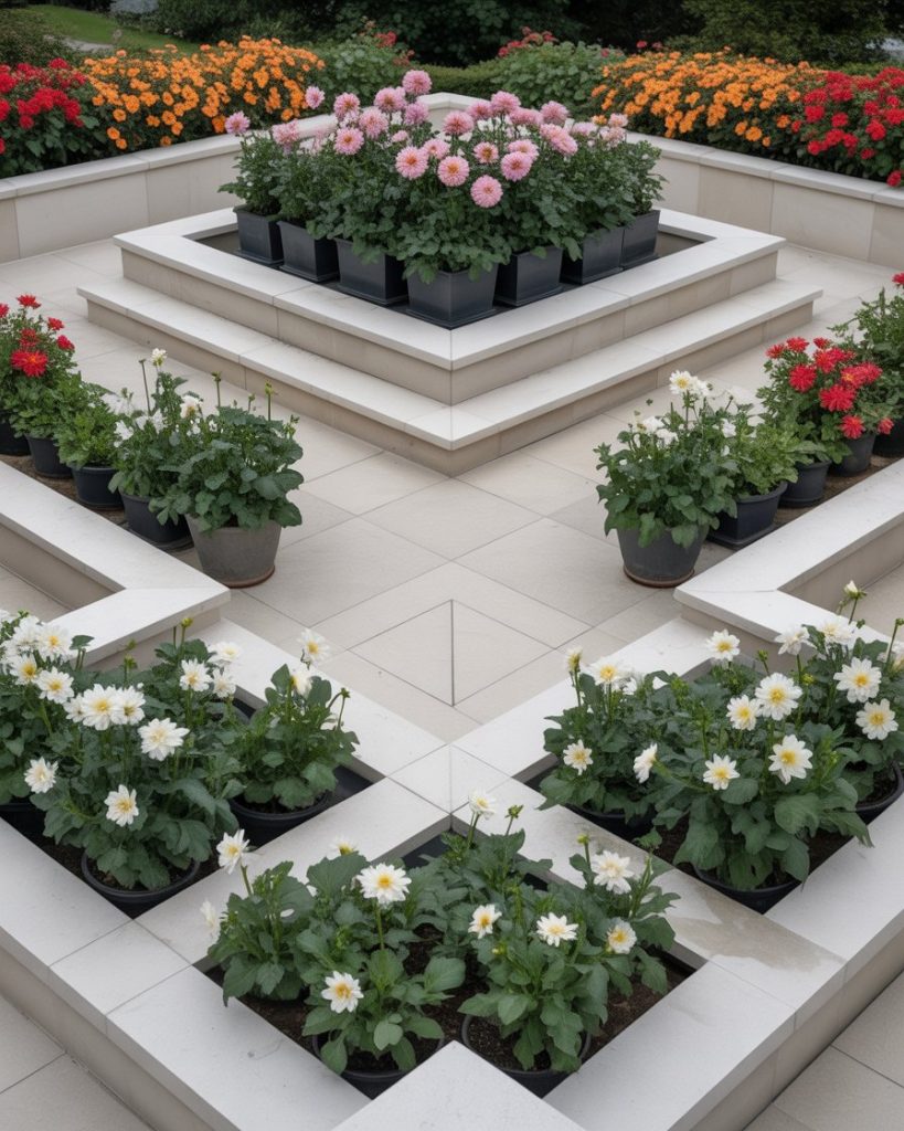 A geometric layout turns the garden into a design statement. Boxwood borders, symmetrical rows of potted plants, and carefully aligned flowerbeds bring visual order. Incorporate beautiful pops of color through tulips or Dahlia for contrast. This approach fits perfectly with contemporary architecture and modern home styling.