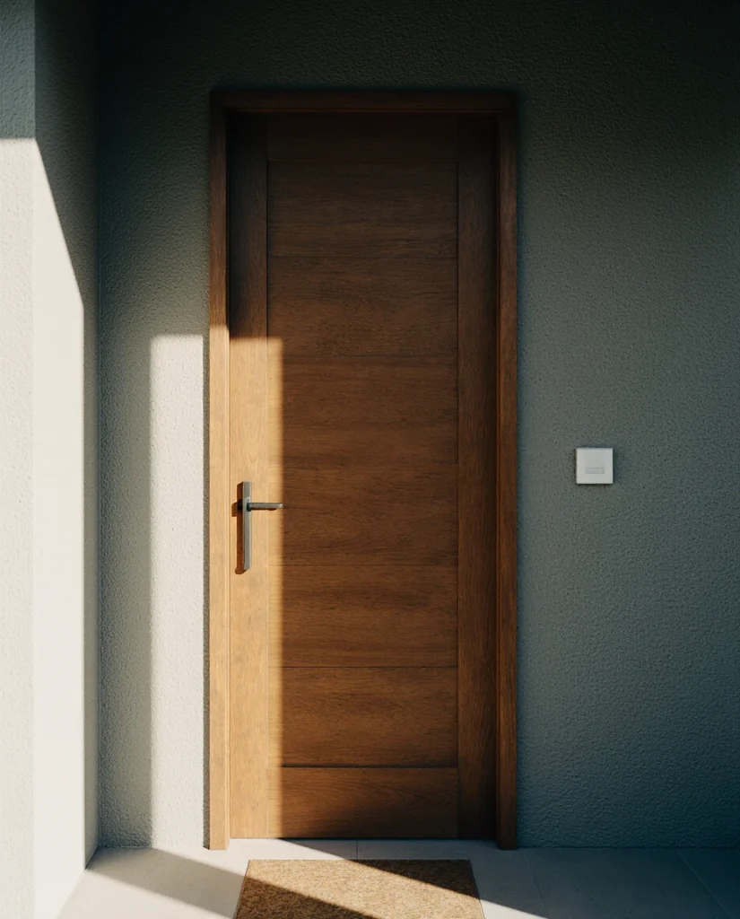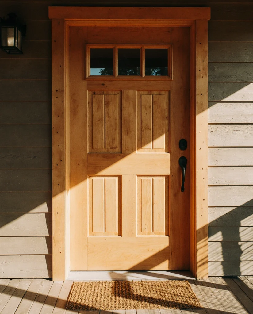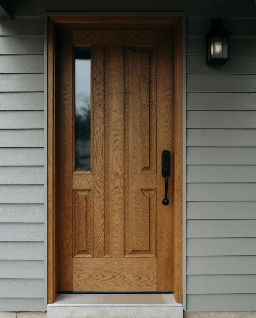 A warm brown front door brings rich contrast to a gray house, creating a grounded and welcoming entry. I’ve seen homeowners choose chocolate or walnut shades to warm modern exteriors. Designers at Studio McGee often mention that natural wood tones feel timeless and complement cool siding beautifully.