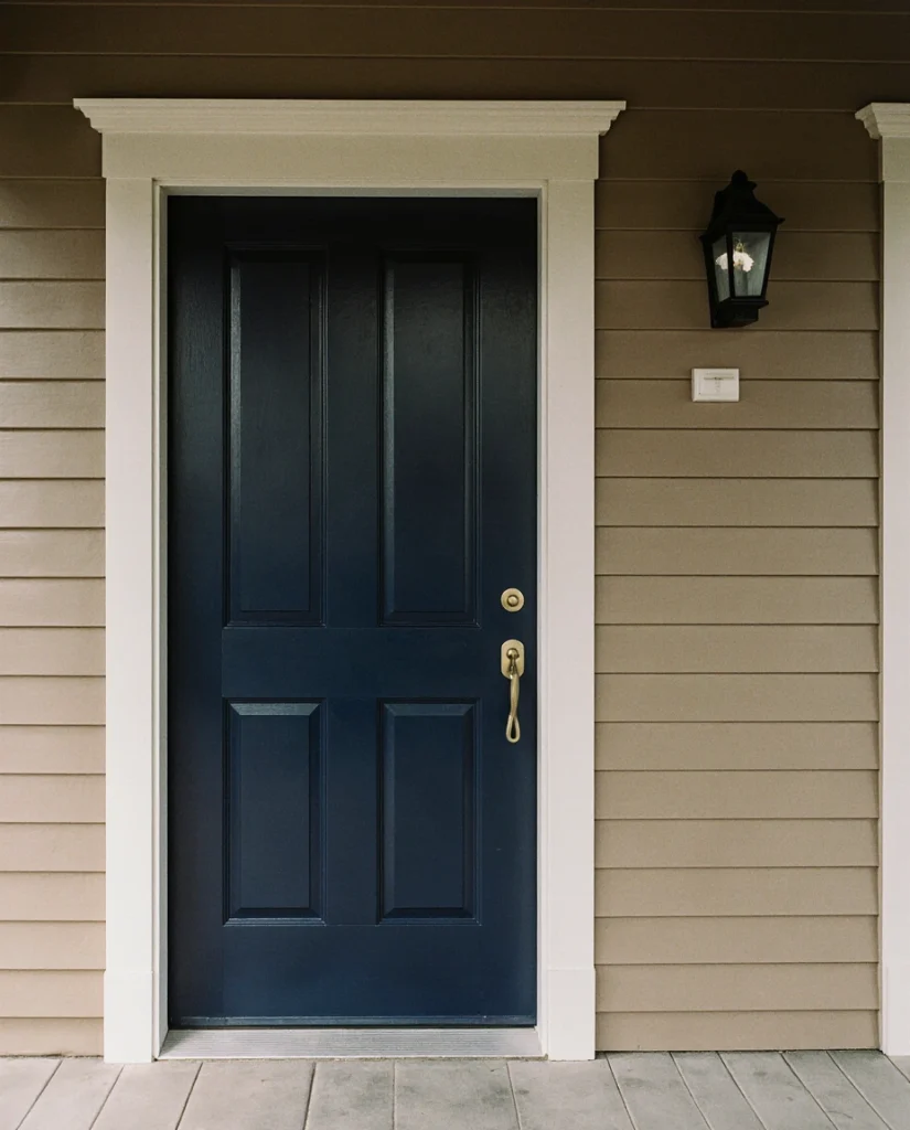 A deep navy door adds elegant contrast to a tan house, offering a coastal yet sophisticated look. While walking through a Chicago suburb, I saw several tan homes with navy doors that looked fresh year-round. Many designers call navy a “forever color” because it stays stylish across decades.