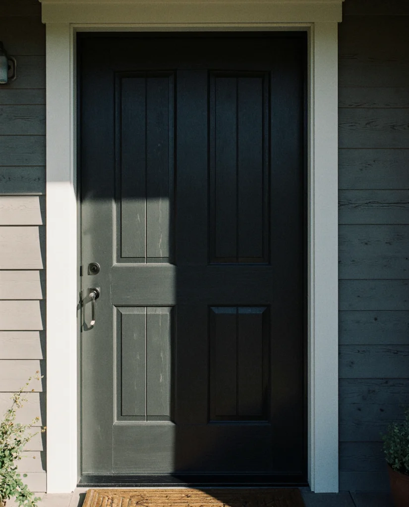 A charcoal door gives a farmhouse exterior a contemporary edge, especially with white or cream siding. While touring new builds, I noticed charcoal gaining popularity for its sharp, clean contrast. Influencers in modern farmhouse design often recommend it for elevating porch style.