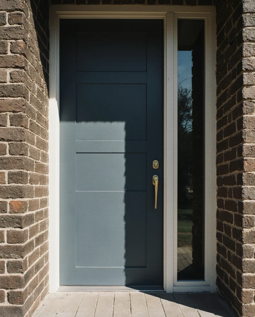 Blue-gray tones soften a brown brick façade, adding subtle elegance. I’ve seen this shade used on older homes where pure blues felt too bold. Color specialists say blue-gray sits perfectly between modern and classic, making it ideal for long-term curb appeal.