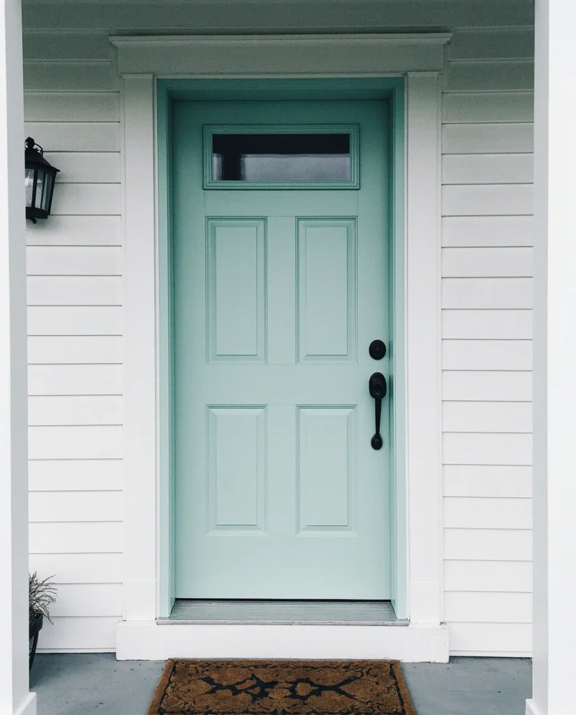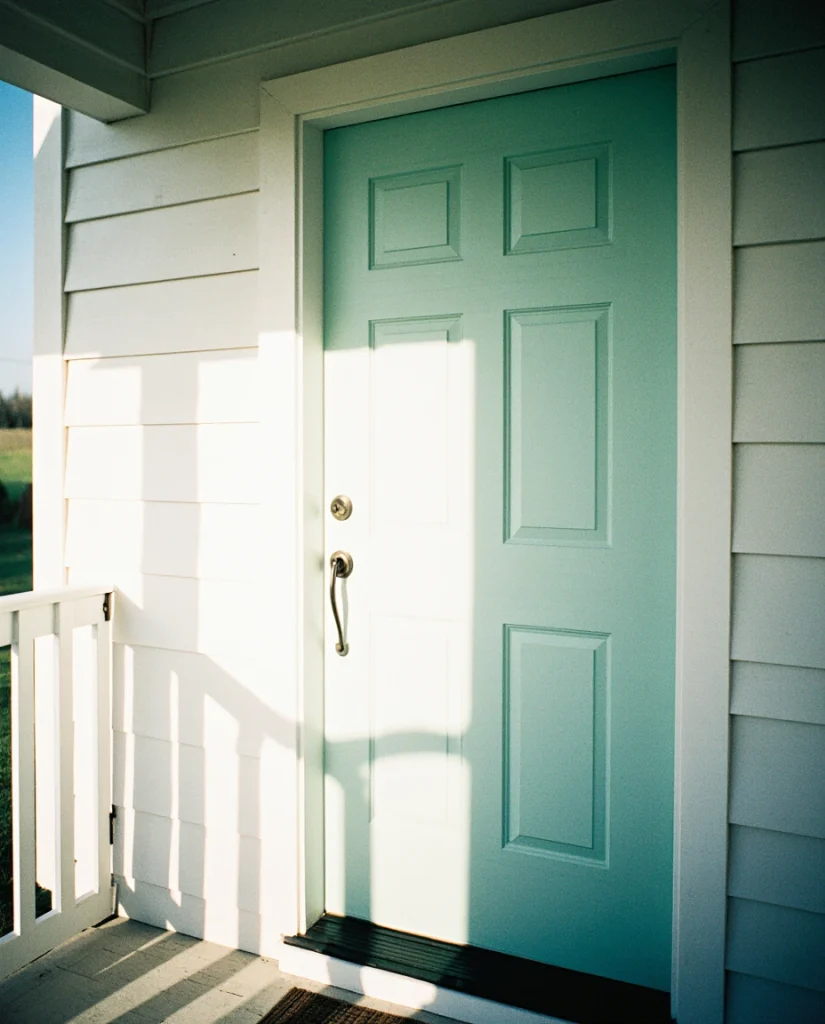 A mint-colored door brings breezy charm to a white house, ideal for warmer climates or homeowners who love light, cheerful palettes. I passed a coastal cottage with a mint door that felt instantly inviting. Designers love mint for its refreshing and youthful vibe.