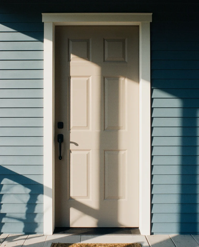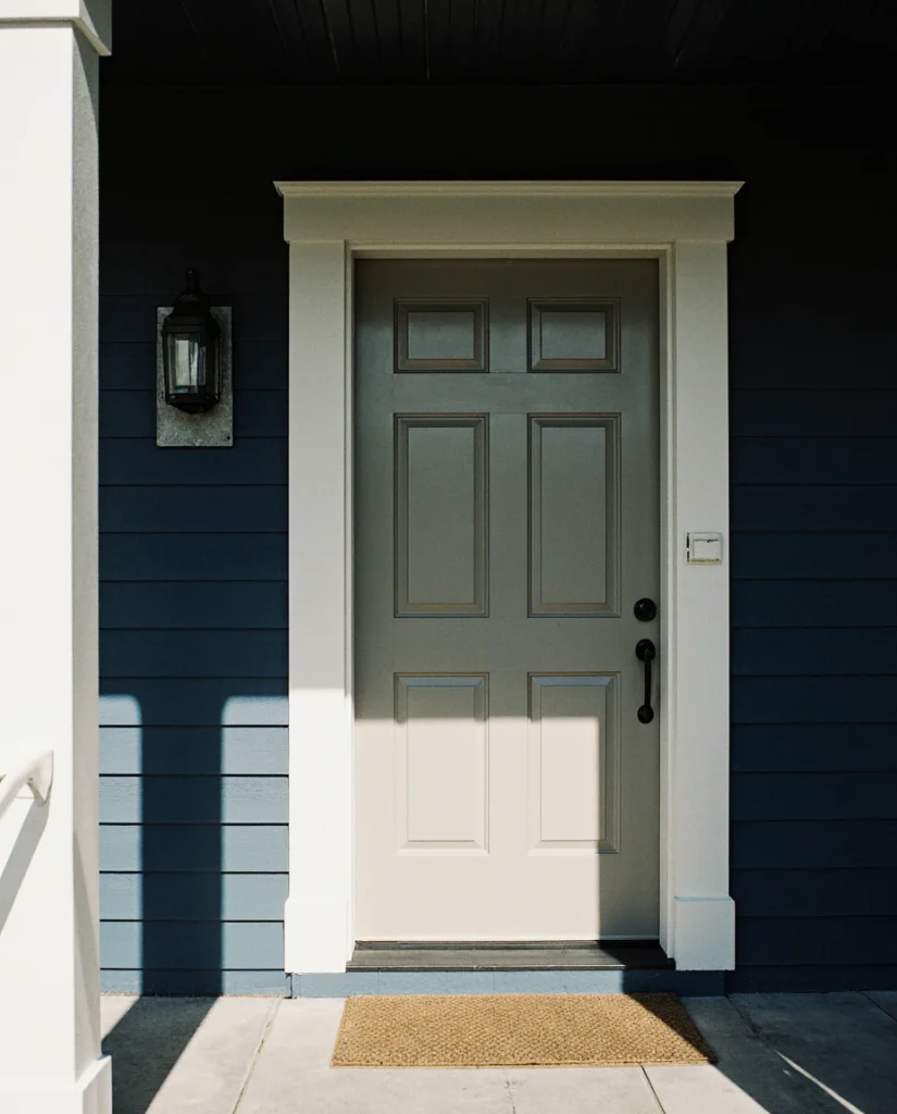 Soft taupe doors add understated sophistication to a blue house, harmonizing cool siding with warm neutrals. I’ve seen taupe chosen by homeowners wanting a gentle alternative to white trim. Decor sites often highlight taupe as an ideal balance color for cooler exteriors.