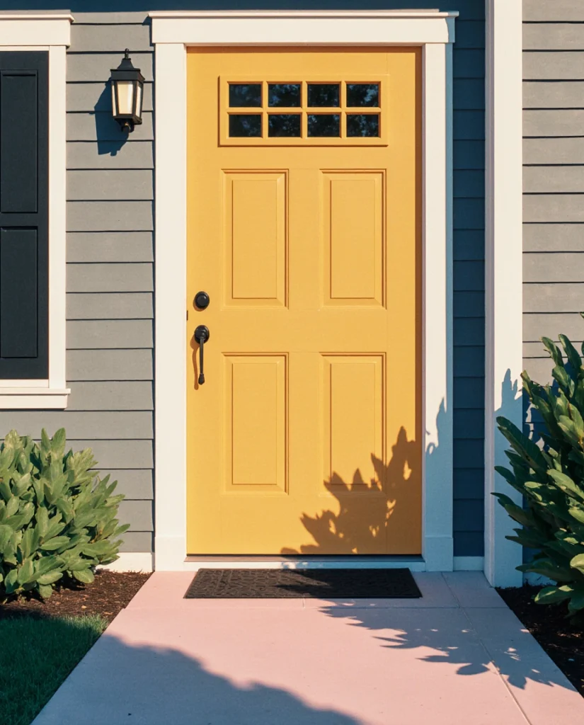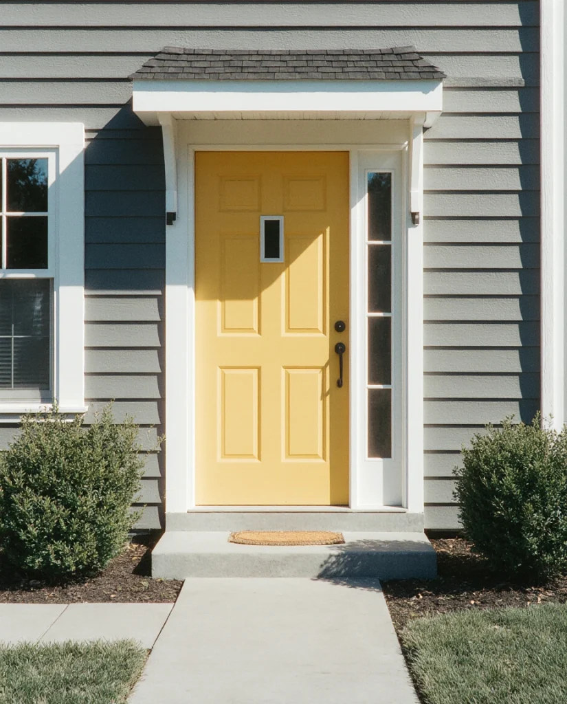 A cheerful yellow front door can lift the look of gray siding, giving a friendly first impression. I’ve seen many homeowners choose yellow because it adds energy without feeling loud. Decorators on Apartment Therapy often mention how yellow instantly warms cool architectural palettes while remaining approachable for everyday homes.