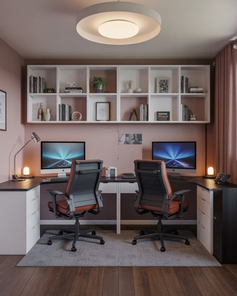 Inexpensively, every couple is enchanted by the merging of two personalities. A long desk serves a dual computer setup, or two smaller desks sit side by side so that it remains practical. A warm lamp and simple storage solutions keep it cozy for both partners, whereas personal décor elements allow each one to express their own identity.