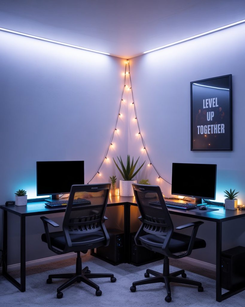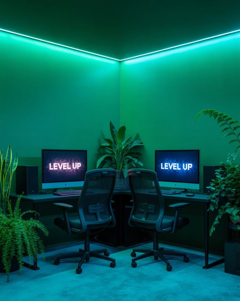 Color psychology holds these hues of green and blue responsible for calming one’s mind. A shared gaming setup in these tones feels refreshing and staves away screen fatigue. Add to that a plant or two and some subtle blue lighting that helps keep the space alluring yet able to focus. Very much fit for pairs of friends or partners who delight in long hours together.