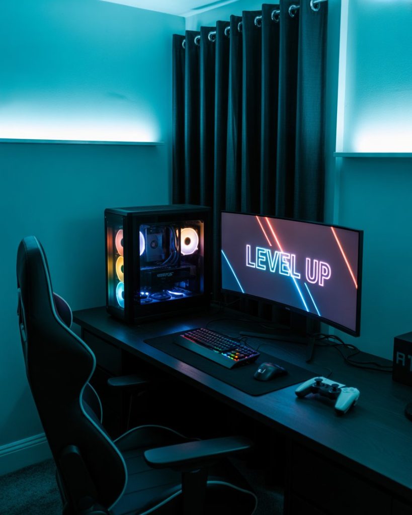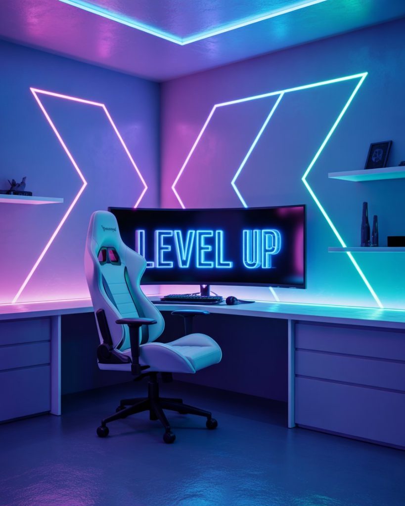 Bring the retro feel of arcades into your man cave or living-room. Bold neon signs, a black cabinet-style desk, and vintage posters create an aesthetic throwback. Add a modern PC or PS5 for some bright blue and purple nostalgia.