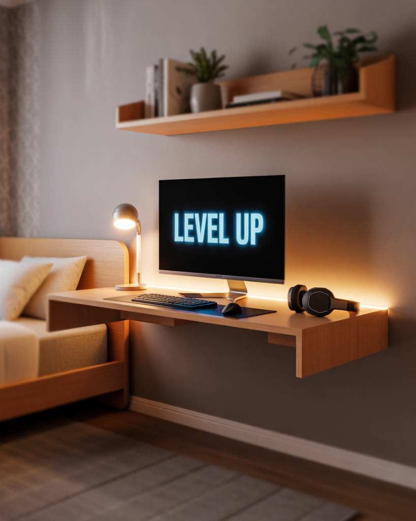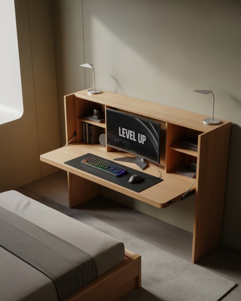 For gamers running out of space, a fold-out desk is exactly a God-sent to be there for them. It can be pushed landward when not in use, quite perfect for tiny bedrooms of the minimalist variety. Hidden compartments for accessories keep the design practical yet aesthetically nifty, turning the room into a multifunctional wonder.