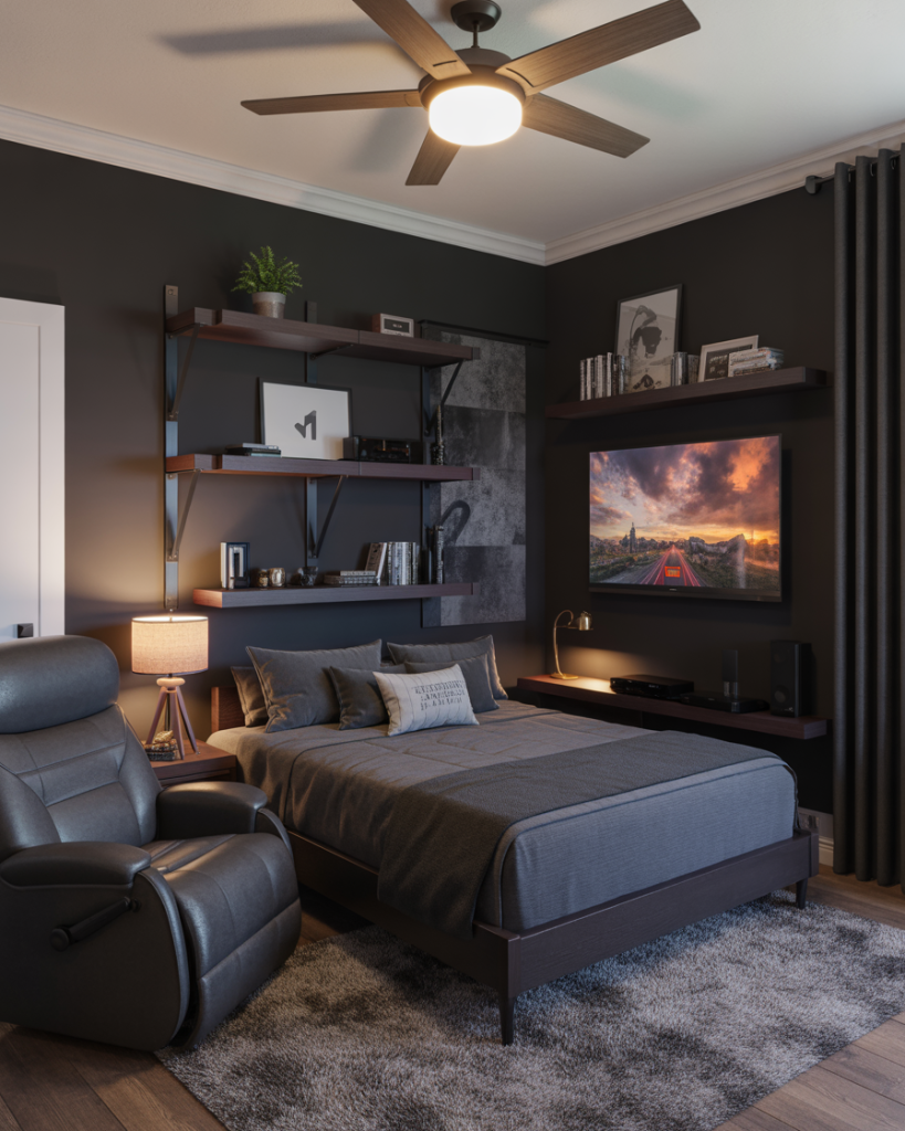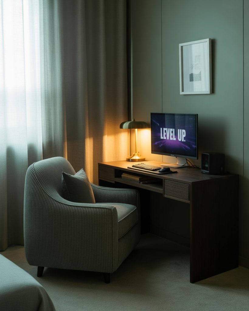 If there is an unused corner, one should convert it into a cozy gaming nook. Throw in a little desk, warm lights, and a plush chair to give it an intimate ambiance. It’s perfect either for boys’ bedroom or small minimalist bedrooms; the nook transforms stale unused space into a super-personal sanctum.