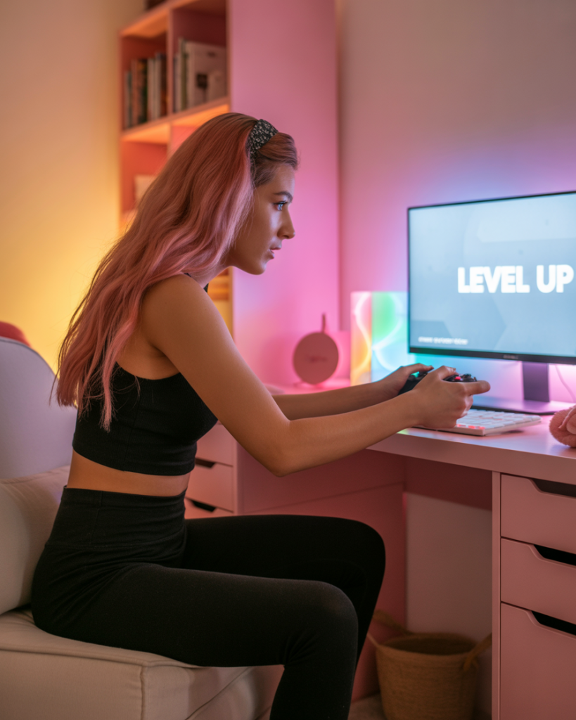 Some players set a style by preferring the pink and purple tones to the usual darker tones. Pastel walls, RGB lights shifting to purple, and pink computer accessories say personality and bring life to the space. That playful palette makes the space feel very unique and empowering, especially for those who adore bold self-expression.