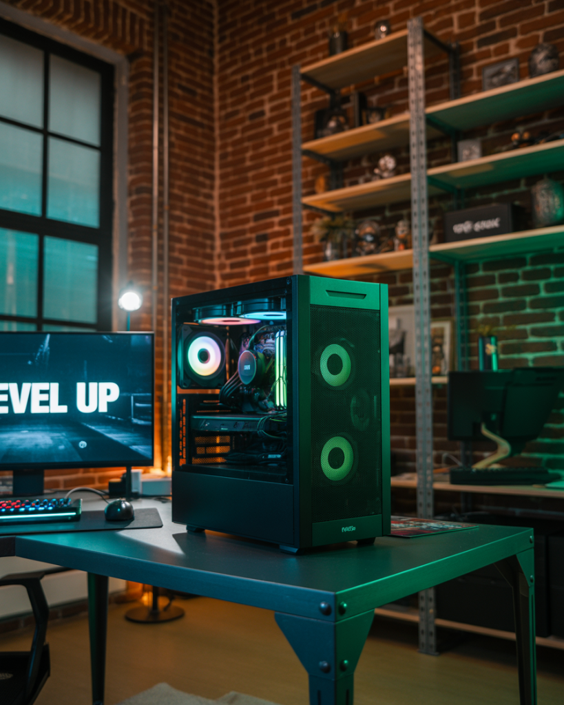 An industrial-styled setup allows for a mash-up of raw textures and modern tech. The one with exposed brick walls and metal shelves with black or green dark accents. The other comes with a PC or PS5 setup on a wooden desk, making it just the right combination of edginess and practicality in a gaming scenario.