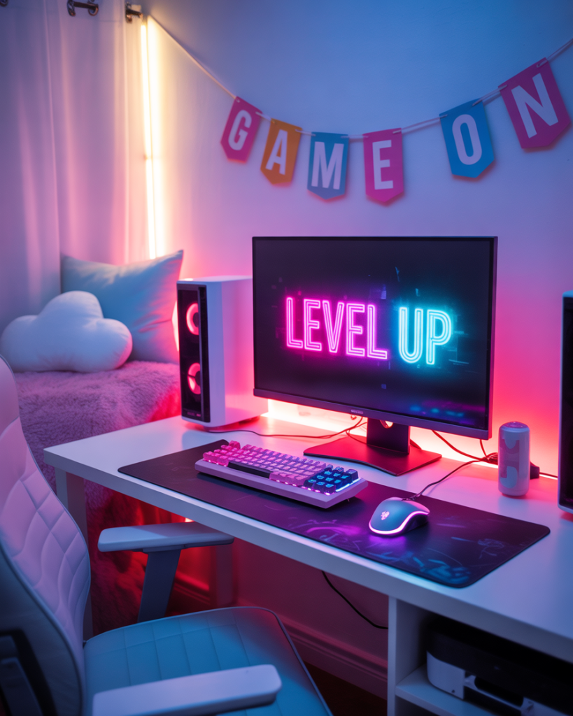 Another trendy design is that of the pink gamer girl station. From pastel-colored desks to personified peripherals, there is much to be said about this style. A little soft wall art, LED lights, and a few plush accessories can liven up the setup and express itself. It is perfect for smaller bedrooms small cozy.