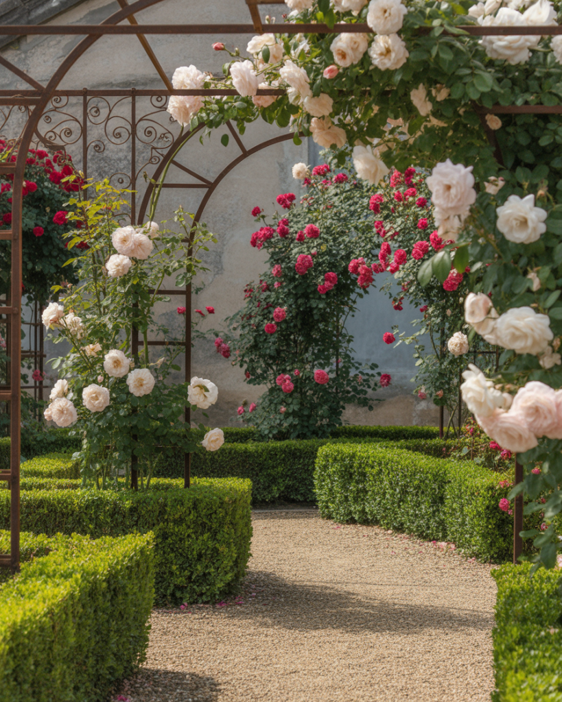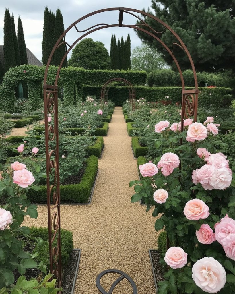 The French rose maze transforms a backyard into an enchanting walk. With fragrant hedges of climbing roses arranged in winding paths, this style is romantic and dramatic. Designers often pair roses with gravel alleys and wrought iron arches to guide visitors. It’s perfect for larger plots where storytelling through design creates a memorable experience.