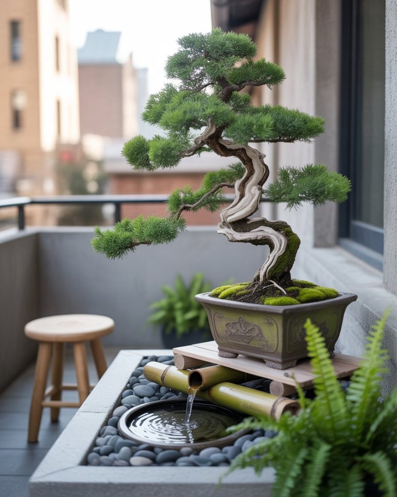 Even the smallest tiny balconies can be transformed with Zen principles. A few smooth stones, a small bamboo fountain, and a single bonsai create an atmosphere of calm. Minimal furniture and vertical shelving keep the layout simple yet meaningful. This idea proves that peace doesn’t require large spaces—it’s about intention, not square footage.