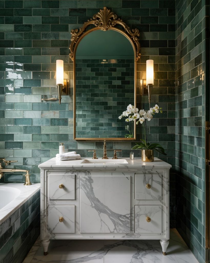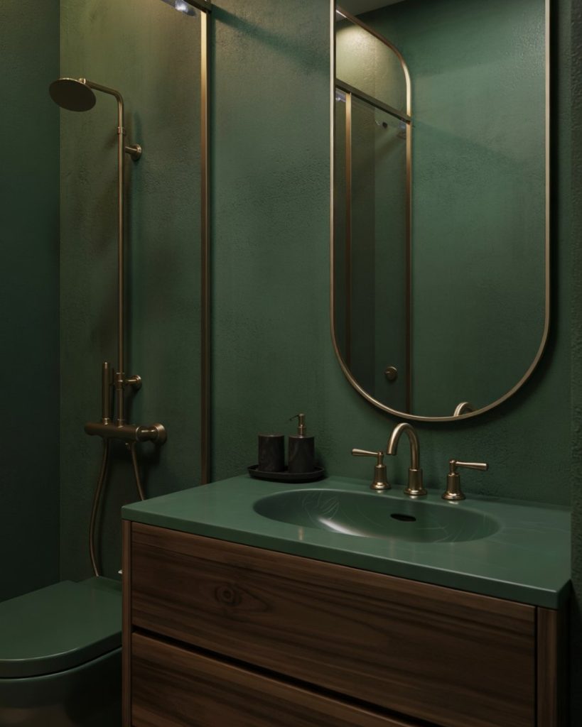 There is a certainty of a feeling of instant luxury with a warm bathroom with dark green and warm metals. This color combination is frequently utilized by boutique hotel designers, since it creates an intimate, vacation-like atmosphere, even if the space is small. Fully dark green walls and panels contrast incredibly with brass and softer-dimming lights to change an ordinary bathroom into a space for ritualized self-care.