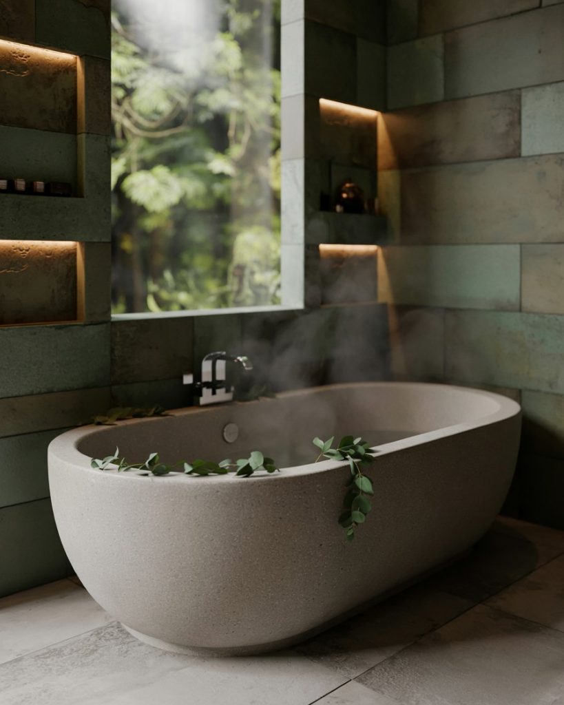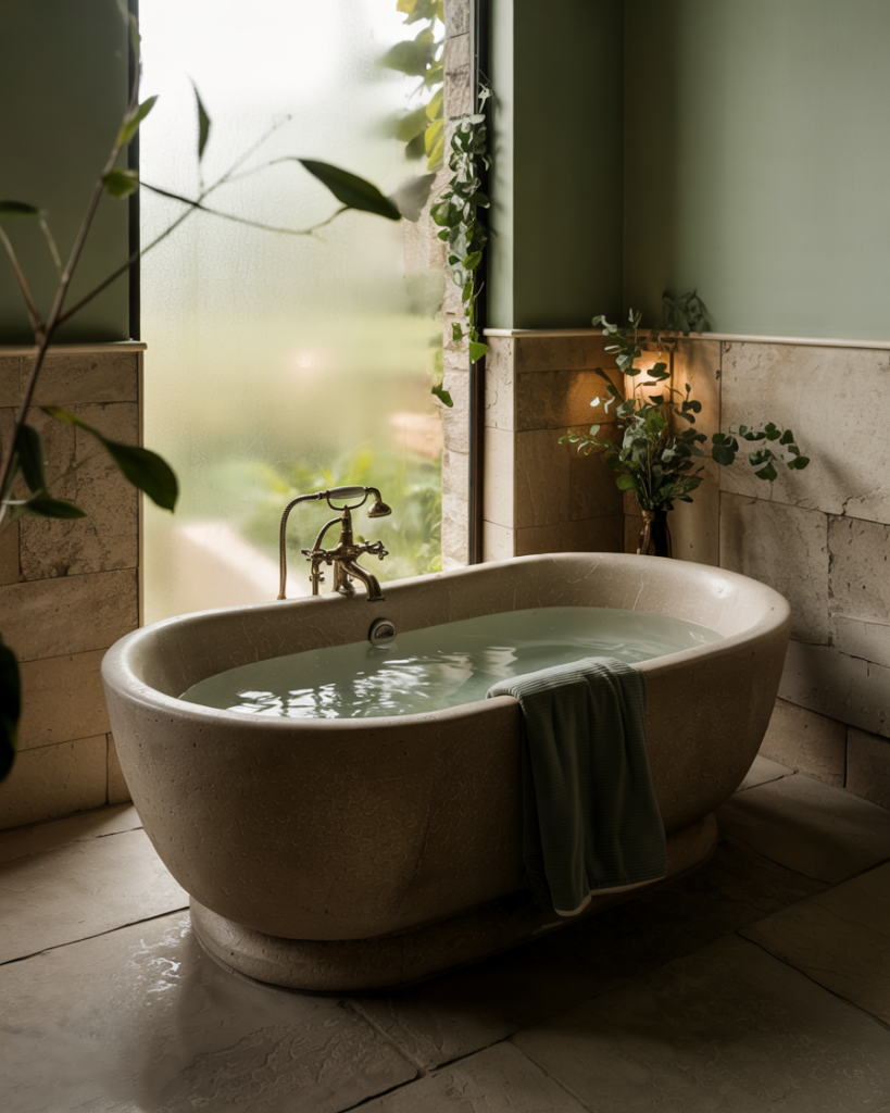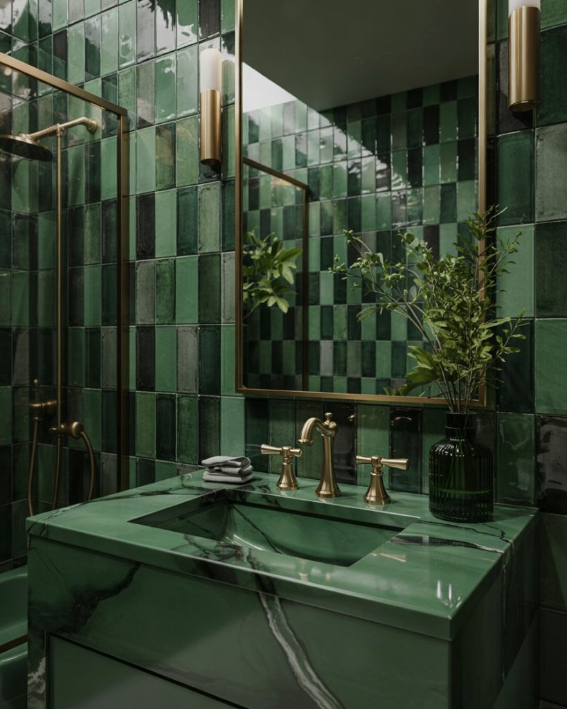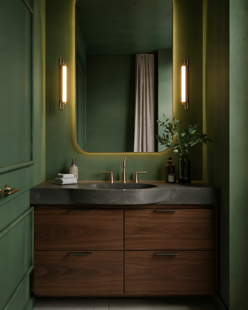Rich forest tones bring grounding energy to a bathroom, creating an atmosphere of total relaxation. Interior designers say that deep forest green walls paired with natural stone tiles make the space feel like a private retreat. Add warm lighting, eucalyptus branches, and a freestanding tub to enhance the spa effect. This design celebrates the balance of luxury and wellness, transforming your bathroom into a restorative escape from the noise of everyday life.