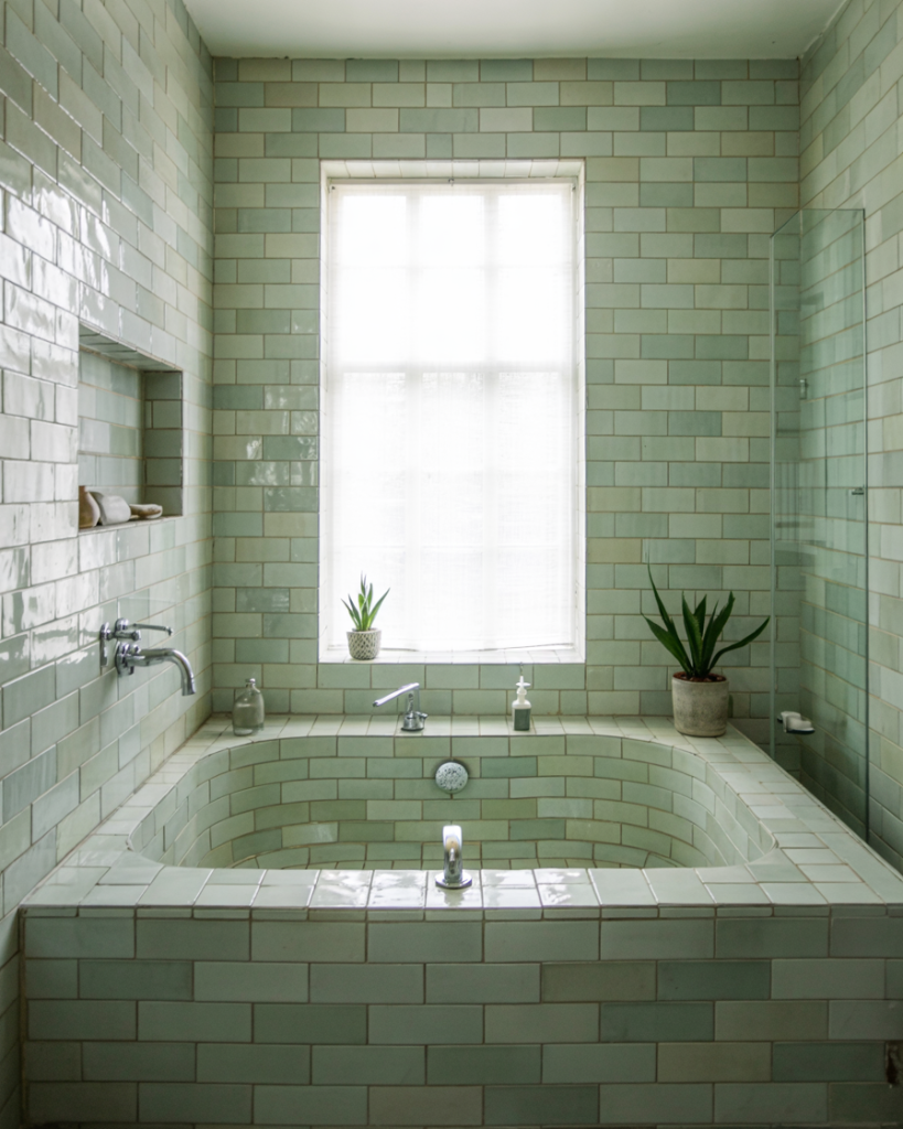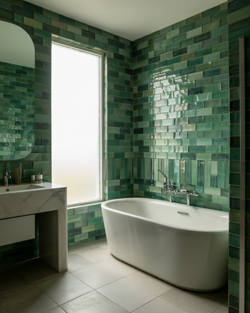 Green tiles with botanical or geometric patterns offer personality that paint alone can’t achieve. Tile makers report rising demand for leafy prints, herringbone, and hand-painted ceramics that turn the shower into a focal point. This idea works for homeowners who like durability and artistry, letting the tile act as both decor and structure without extra accessories.