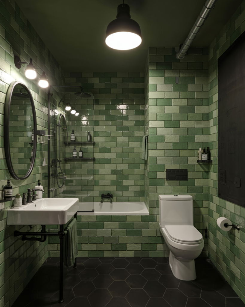 Combining black and green gives any bathroom a striking industrial feel with modern sophistication. Exposed brick, matte black pipes, and deep green paint or tiles create bold contrast and visual texture. Designers at Architectural Digest highlight this look as ideal for loft apartments or city dwellings seeking drama and depth. Add Edison bulbs and metal mirrors for a raw yet stylish finish that feels urban and timeless.