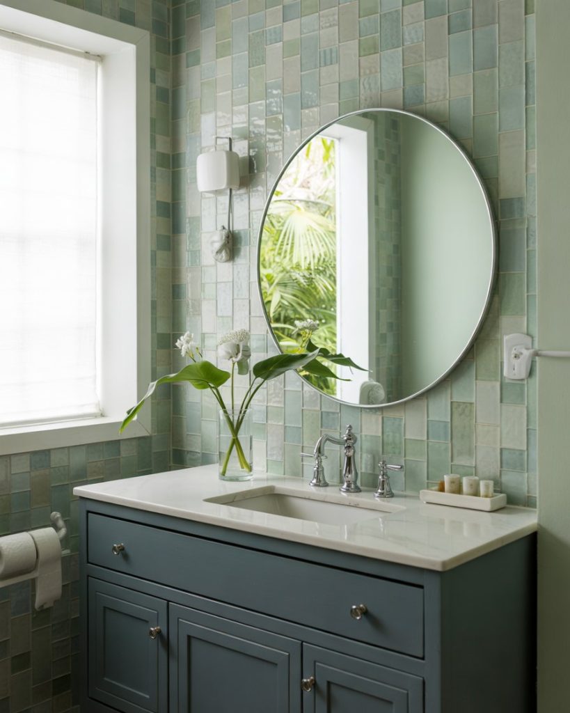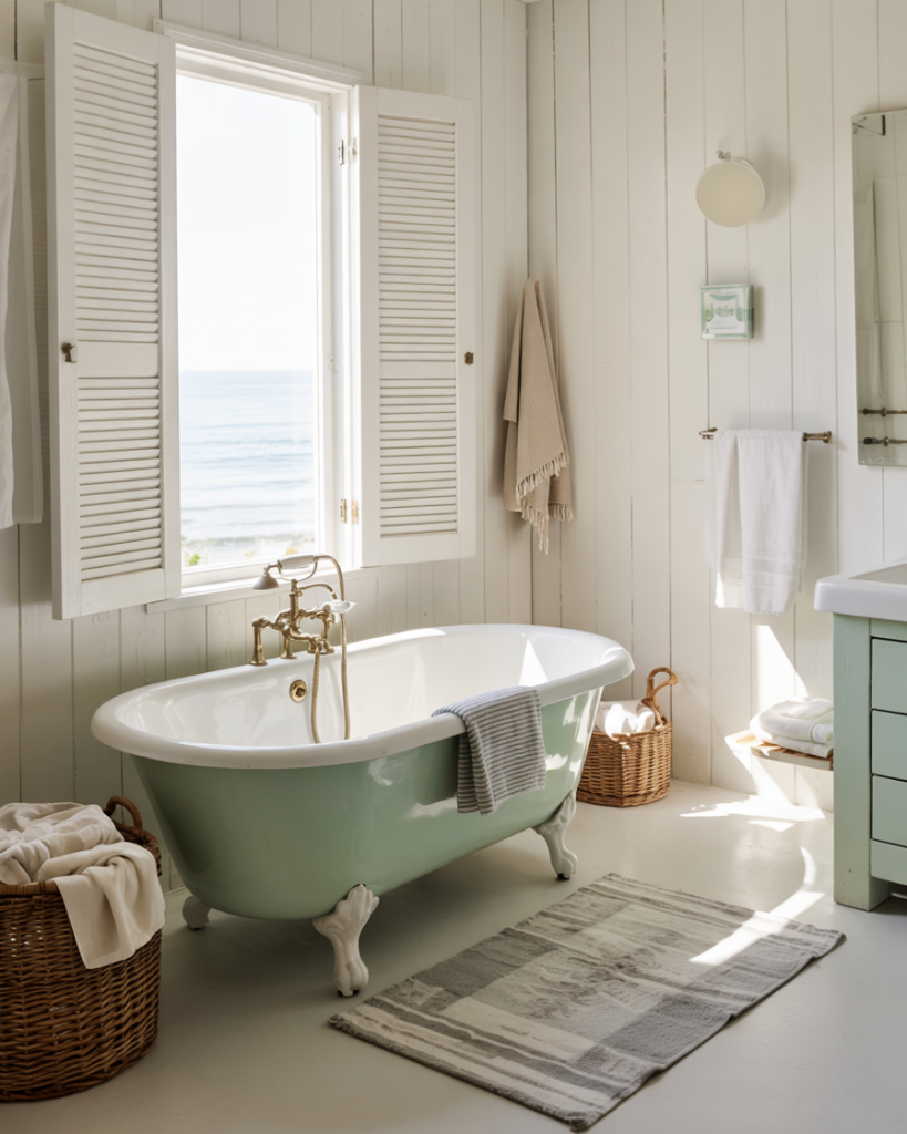 The soft Seafoam palette captures the essence of seaside relaxation while staying refined. Light seafoam tiles or paint, whitewashed wood, and woven textures form a serene coastal-inspired setting. Designers note how this shade pairs effortlessly with brushed brass and seashell decor, creating freshness without cliché. Perfect for beach homes or anyone craving ocean tranquility indoors.