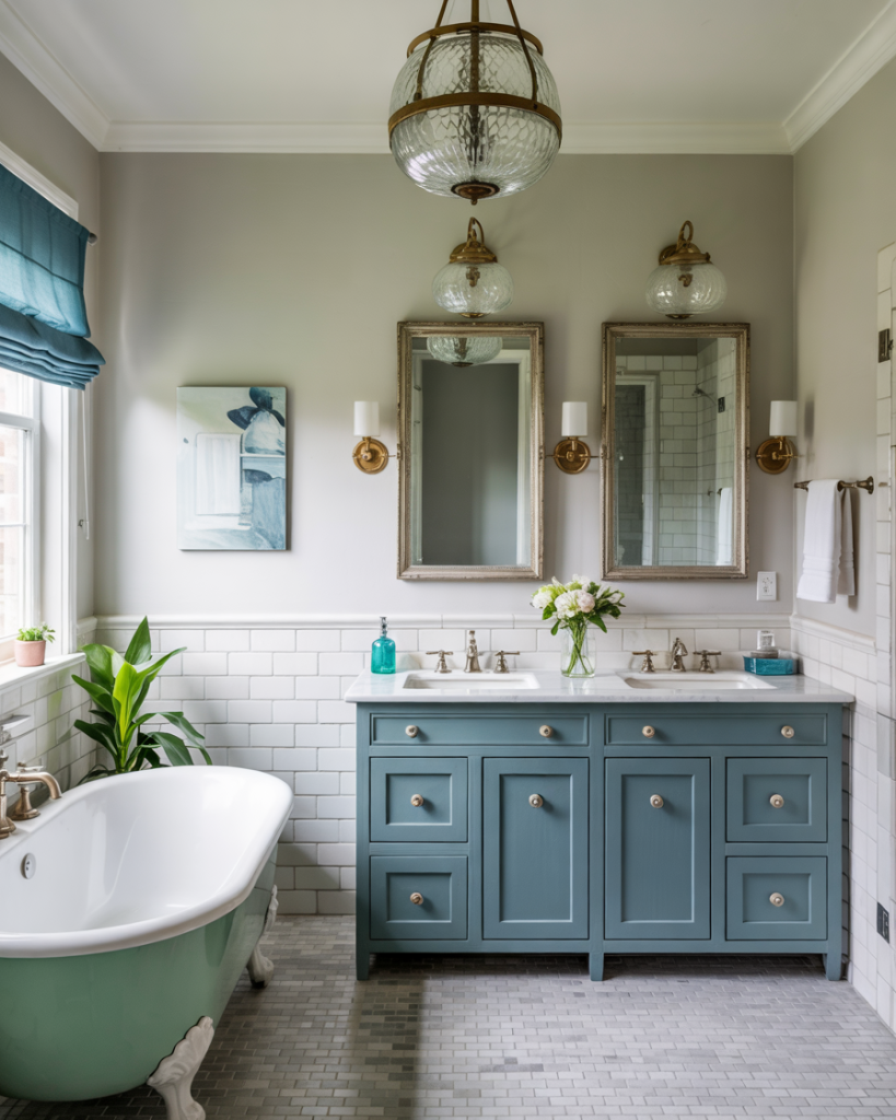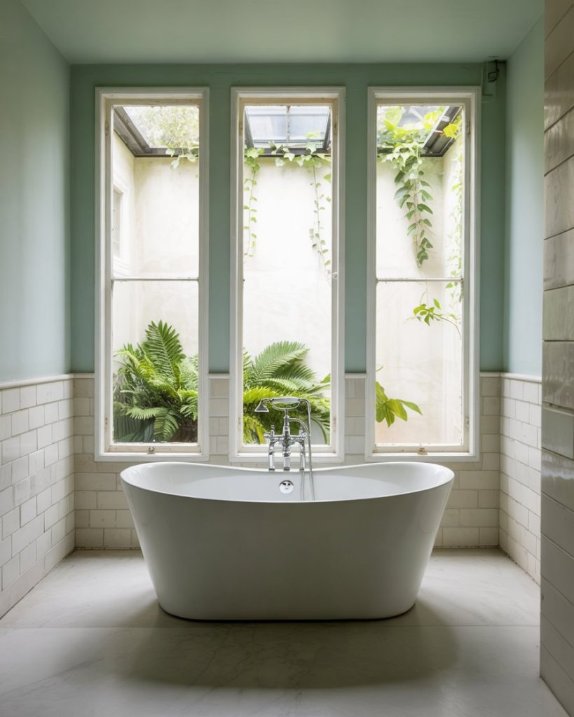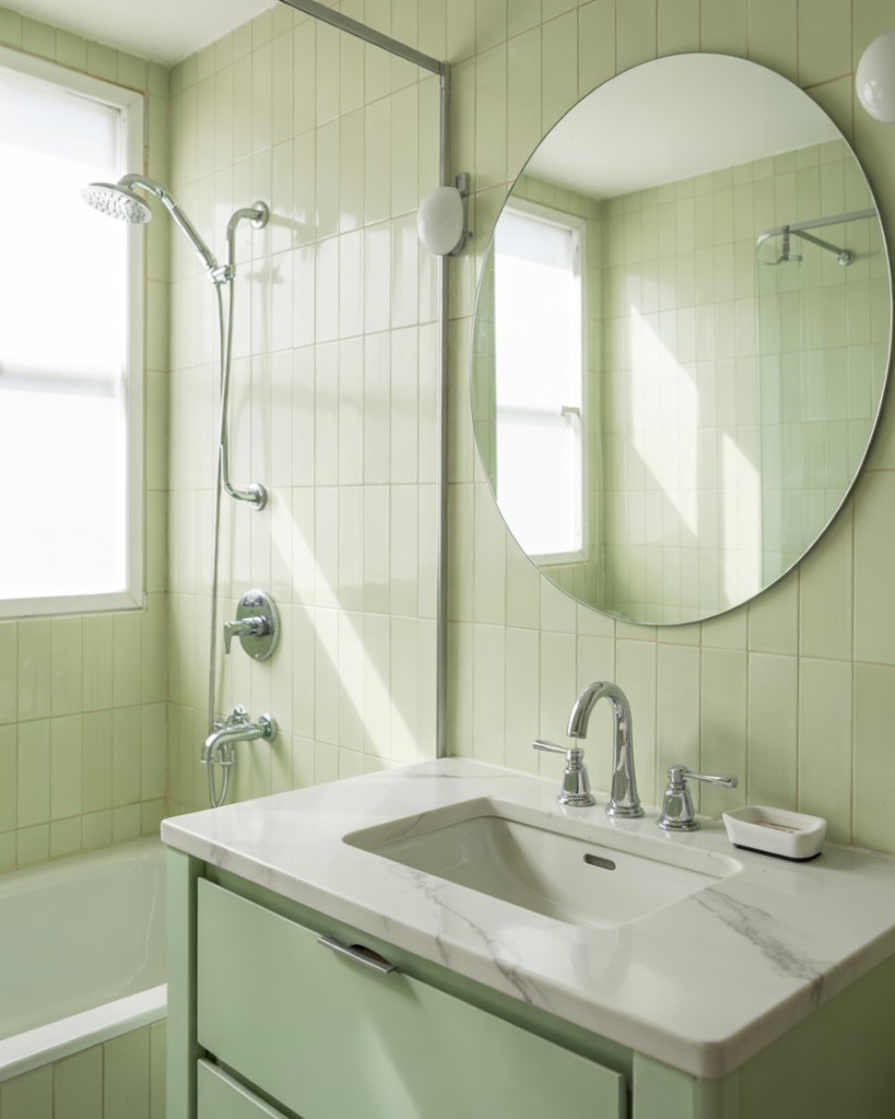 A mint green bathroom exudes freshness and clarity, perfect for small or contemporary spaces. Mint works beautifully with white marble, chrome fixtures, and soft textiles for a crisp, uplifting atmosphere. Homeowners who love minimal design appreciate mint’s lightness and its ability to make tight areas appear larger. This tone radiates positivity, especially under natural morning light.