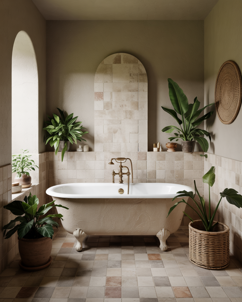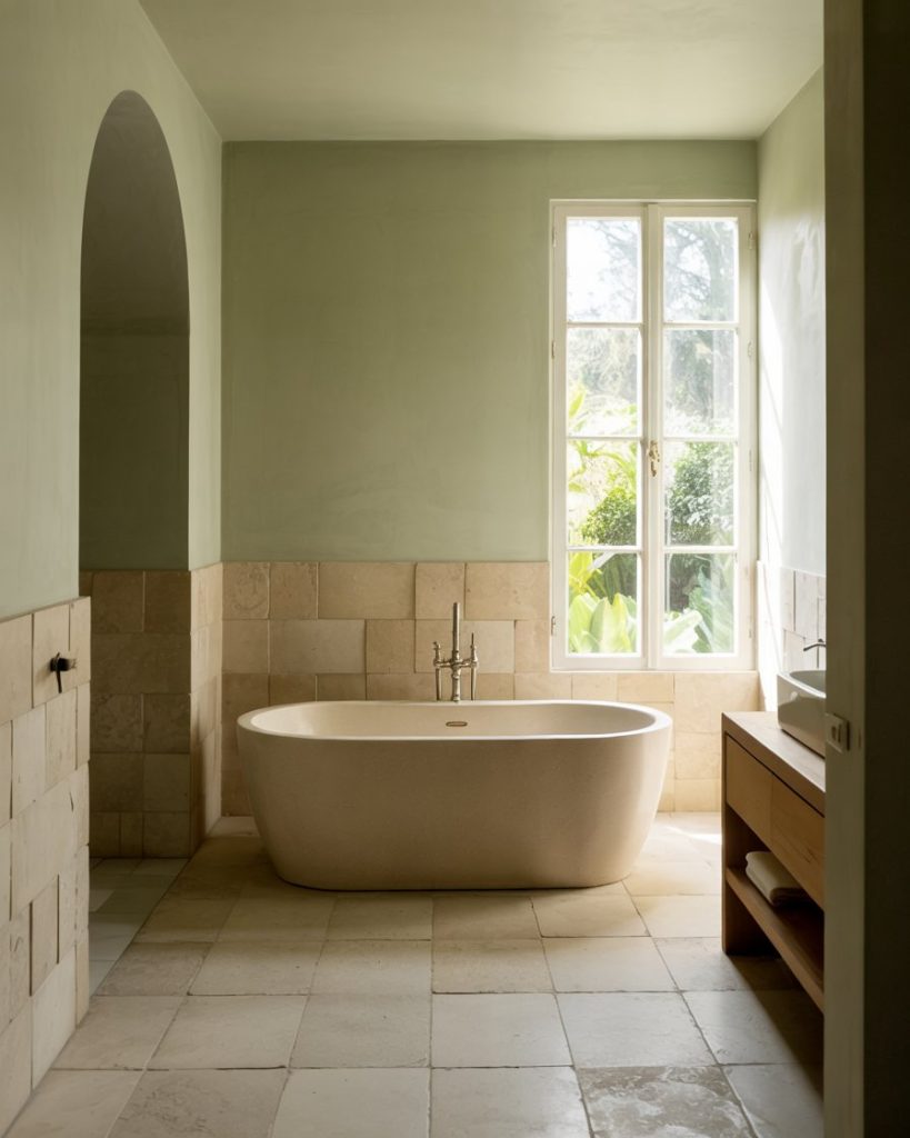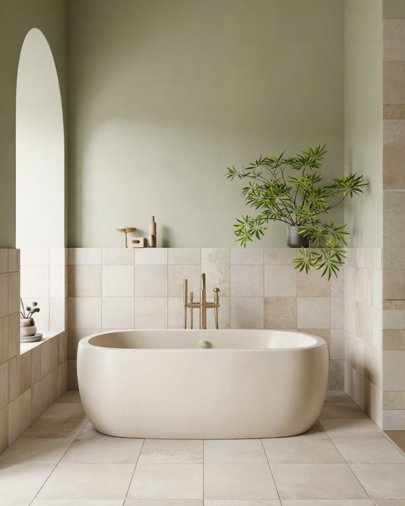 For modern organic design lovers, pairing beige and green tones offers subtle sophistication. With sage walls, beige tiles soften harsh edges and create a balanced natural palette. This combination enhances light reflection, making a bathroom feel more spacious. It is a calm, versatile elegance that works across styles from boho to minimalist, making this a perfect option.