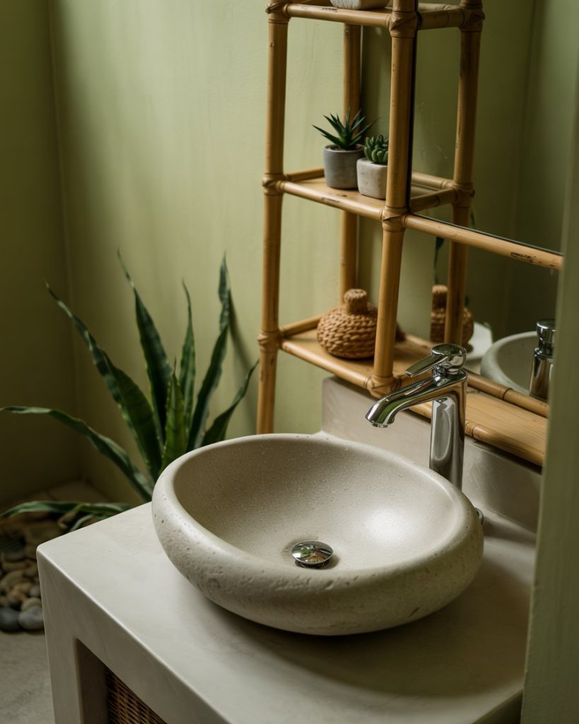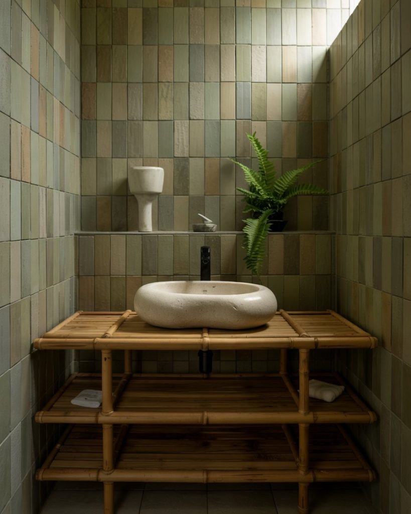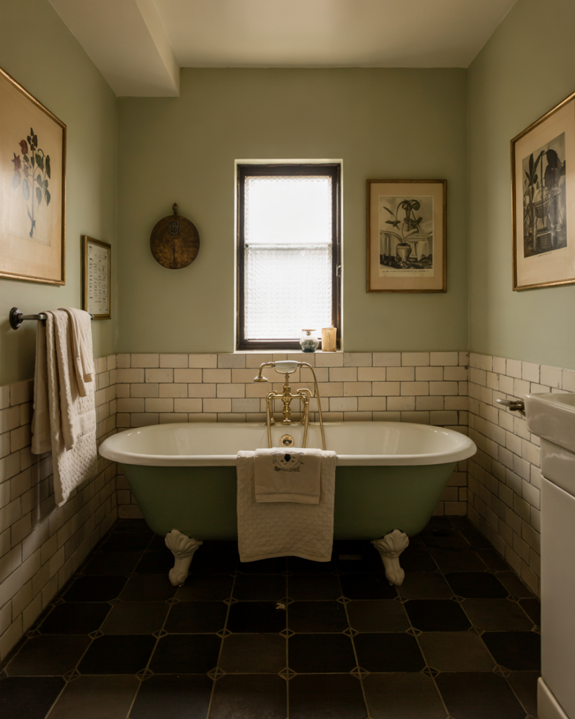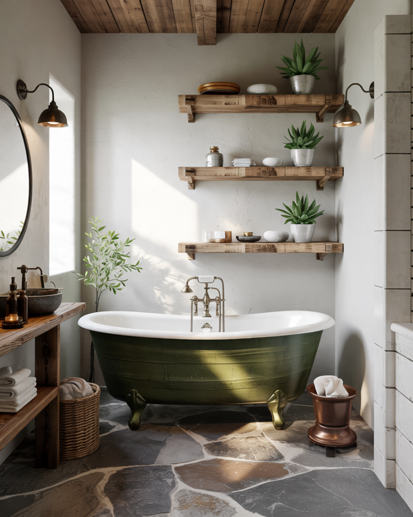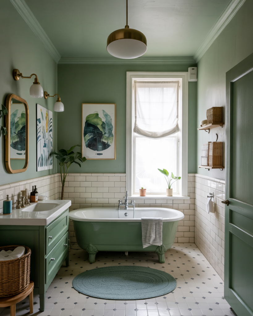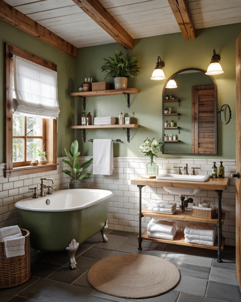 Using deeper olive shades with stone flooring and iron lighting creates a cabin-in-the-woods mood. I once stayed in a Colorado rental where this exact combo made even a tiny washroom feel grounded and safe, like a forest hideaway. Add rough wood shelves and woven baskets to complete a modern cabin retreat that feels curated, not unfinished.