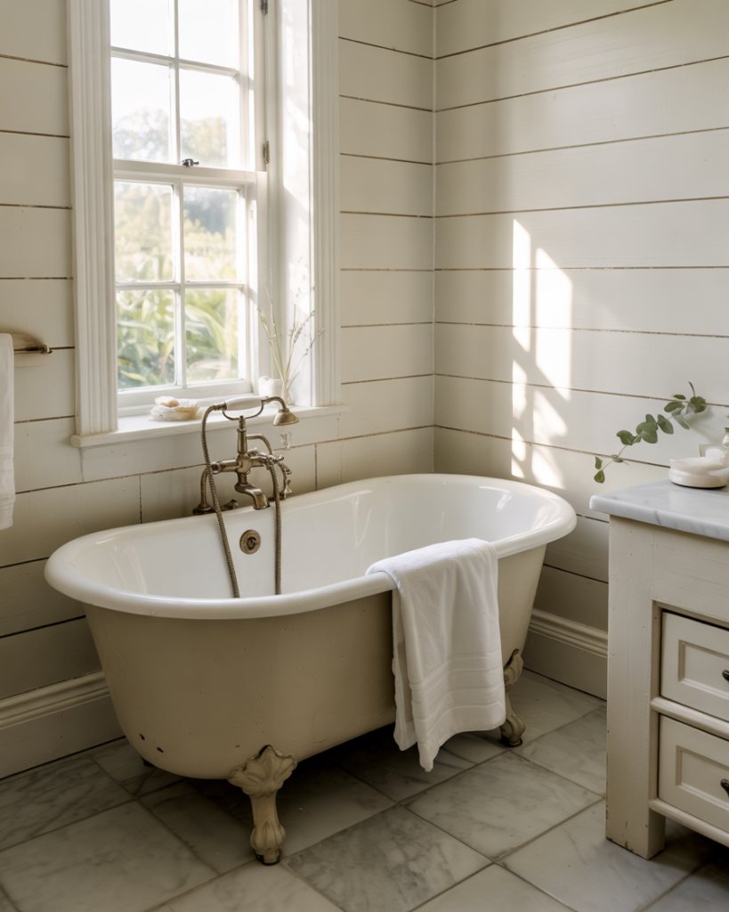 For modern farmhouse bathrooms, light sage shades bring a cozy charm and a gentle pop of color that remains timeless. This design feels homely yet refined with shiplap walls, antique bronze fixtures, and white stone counters. HGTV stylists recommend light sage for its balance of freshness and comfort—perfect for those who cherish vintage style with modern usability.