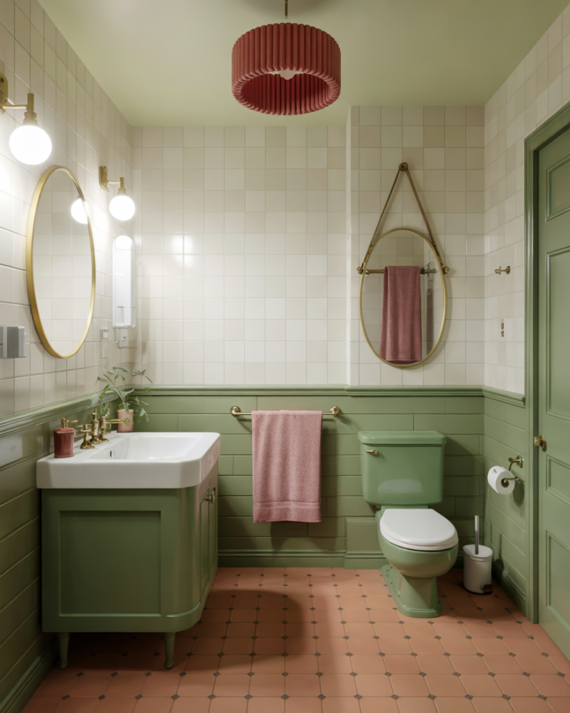 Pink and green combinations reminisce about the lovely bathrooms of the 1940s, yet feel contemporary with the addition of modern lighting and shaped mirrors. Designers like Sarah Sherman Samuel use this combination to add a softness and romantic feel to guest areas and antique houses with character. Vintage-inspired with features like terracotta tiles or pastel sinks, it creates nostalgia without looking like it is overly designed or retro.