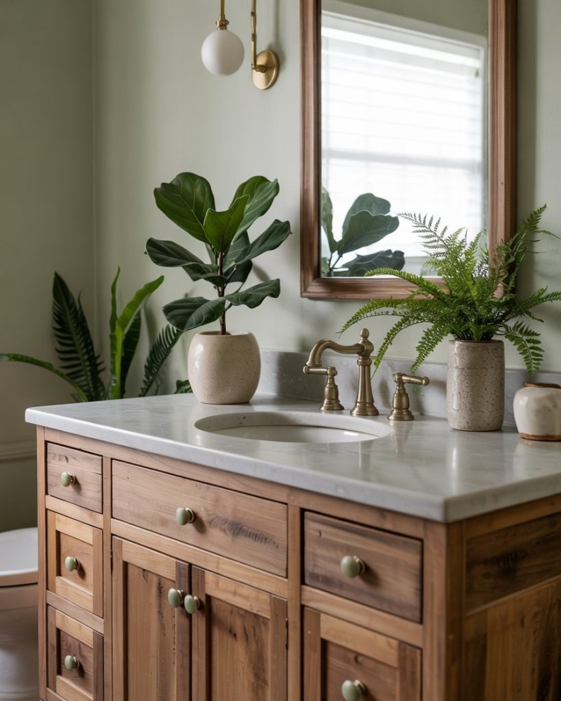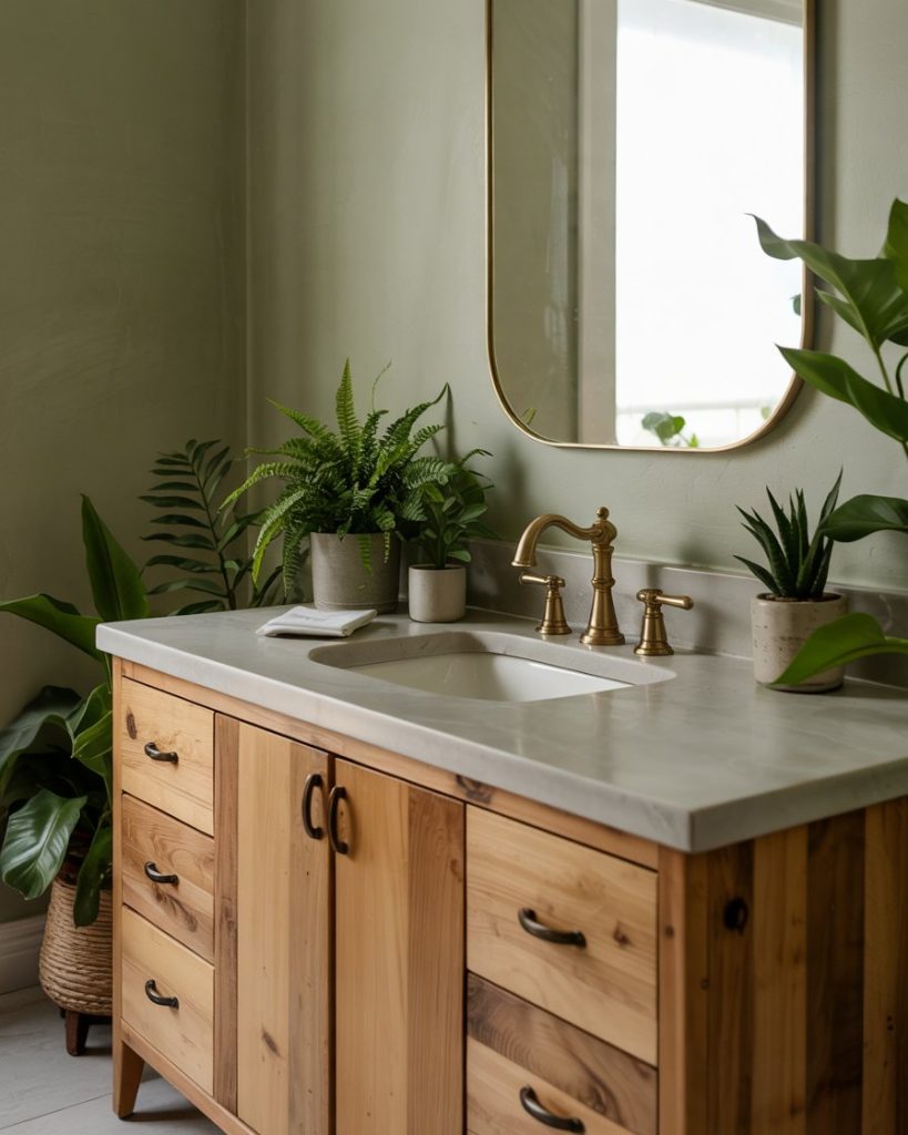 A wood vanity paired with green walls or hardware delivers warmth that keeps bathrooms from feeling sterile. Designers like Leanne Ford often mix reclaimed oak with soft sage or olive tones to create a refined rustic look. This pairing suits cabins, suburban remodels, and lofts, offering natural texture without abandoning modern style.