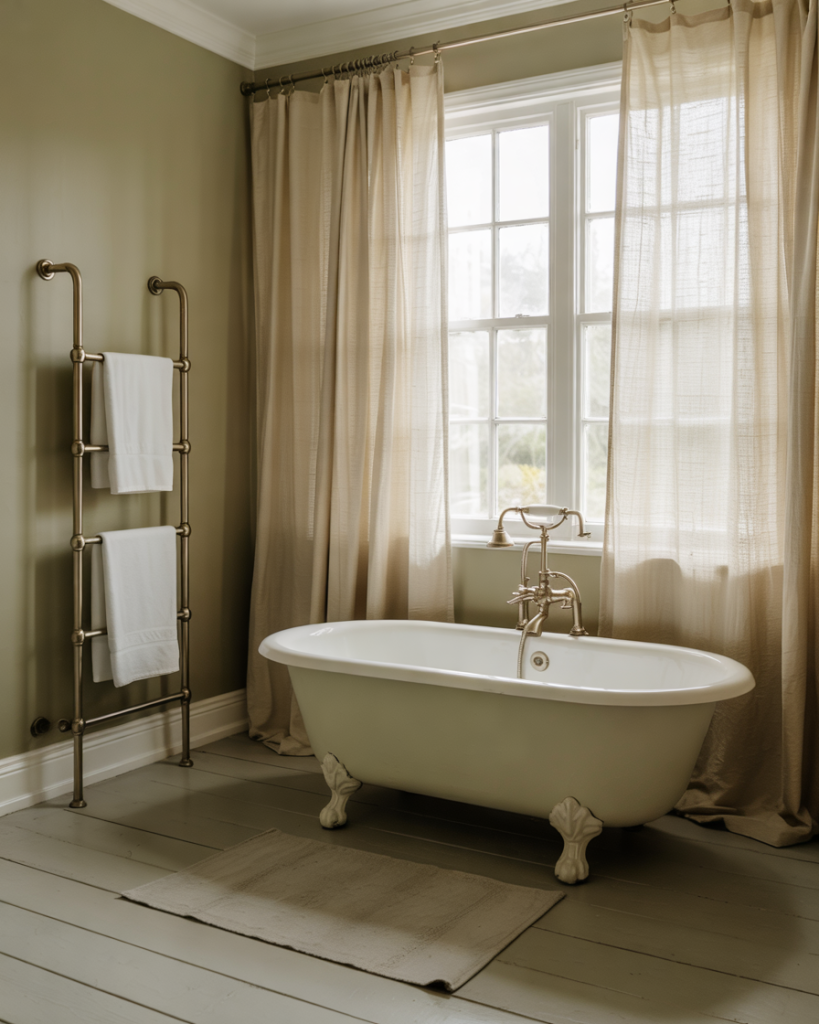 A light olive palette brightens bathrooms that lack natural sunlight while still offering depth. Olive behaves like a neutral but feels calmer than beige or gray, especially alongside linen curtains and brushed nickel hardware. Domino Magazine notes it works across coastal, farmhouse, and classic interiors, making it an adaptable choice for powder rooms and compact layouts.