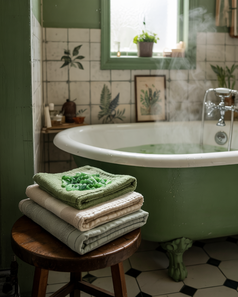 Layering green decor—candles, textured rugs, framed prints—lets renters embrace the trend without painting walls. Shades like forest or bottle green feel artistic when mixed with vintage finds and dim lighting. Influencer Athena Calderone often says bathrooms should “tell stories,” and this approach proves you can style mood and personality even in a small footprint.
