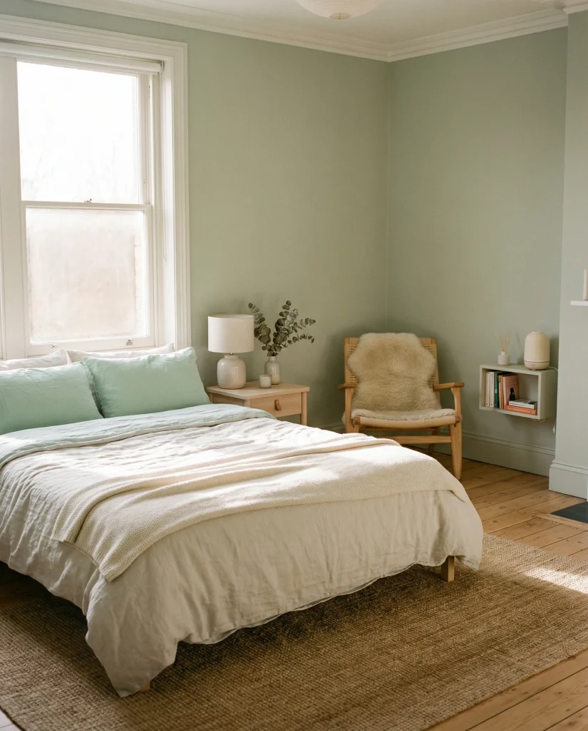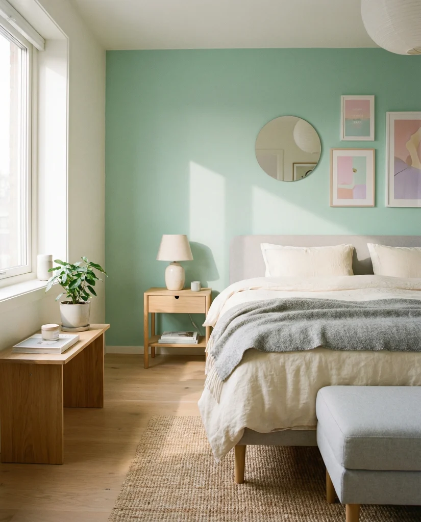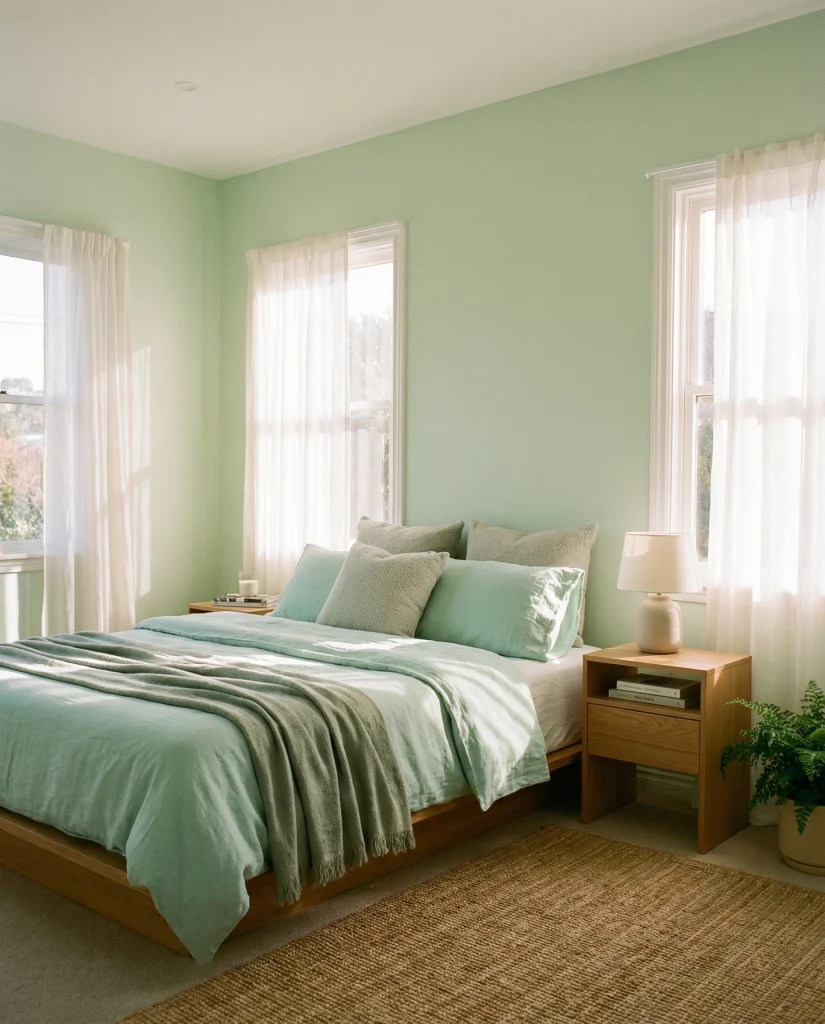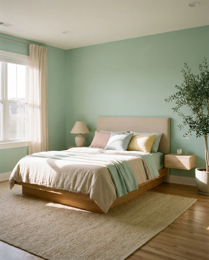 Soft Light, Pastel, Mint, and Sage tones offer a fresh, cheerful spin on green bedrooms. This palette works beautifully for younger homeowners or renters who want a modern aesthetic that still feels gentle. The look balances simplicity with visual interest and pairs effortlessly with white furniture or light fabrics.