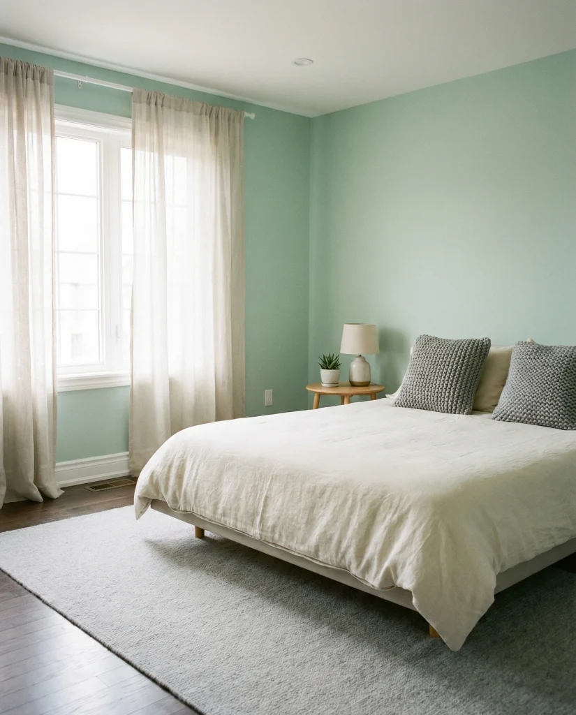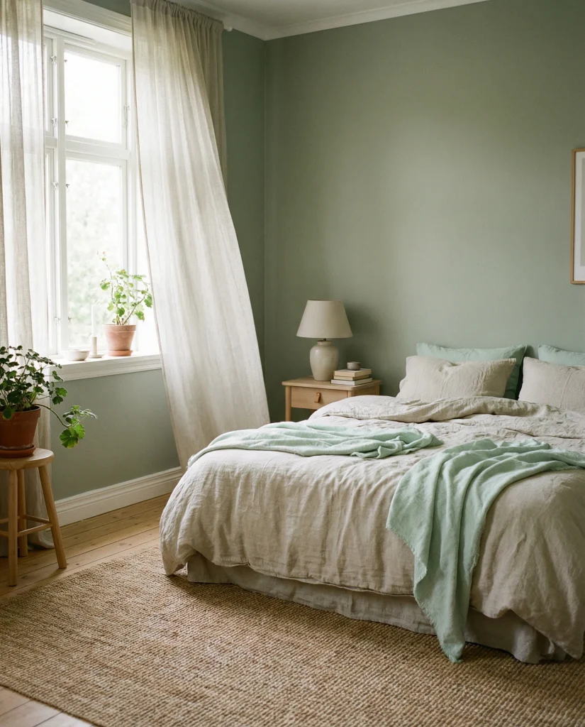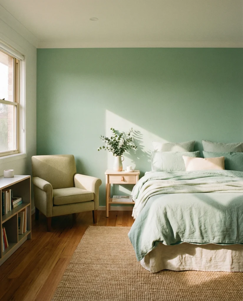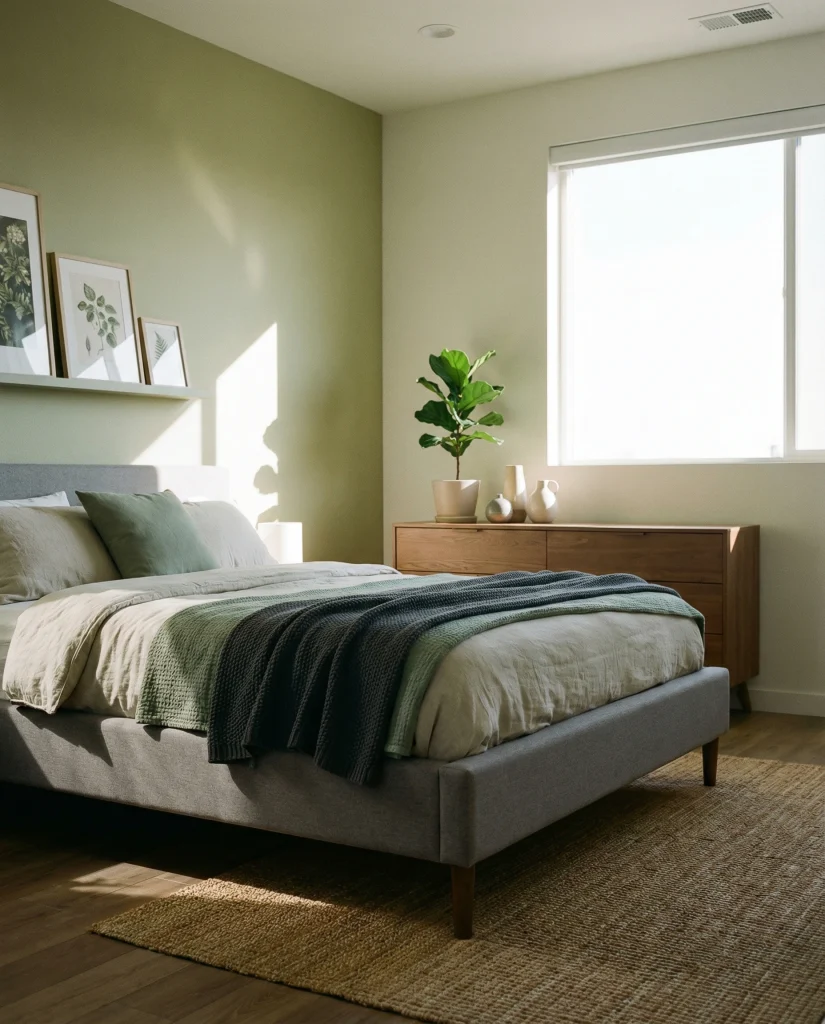 Soft Light, Pastel, Mint, and Sage tones offer a fresh, cheerful spin on green bedrooms. This palette works beautifully for younger homeowners or renters who want a modern aesthetic that still feels gentle. The look balances simplicity with visual interest and pairs effortlessly with white furniture or light fabrics.