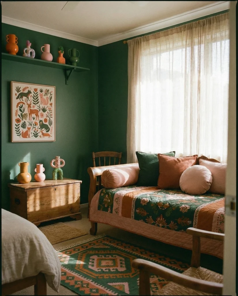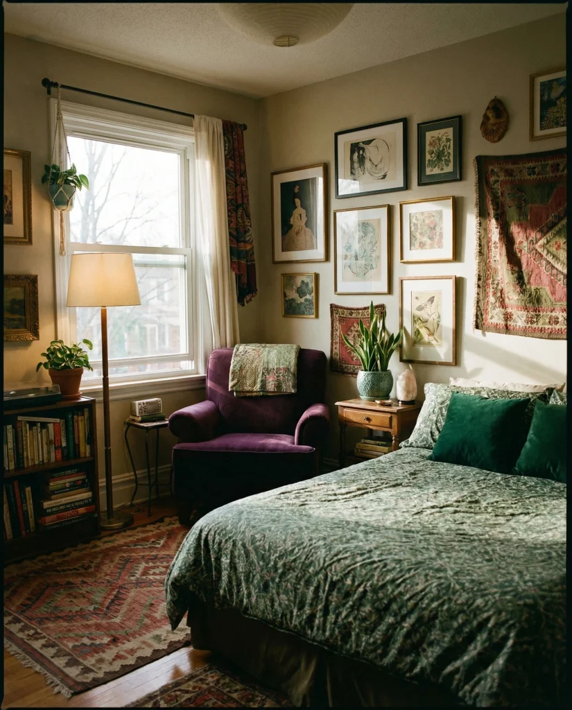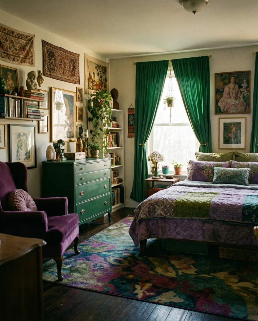 A bold mix of purple and emerald, olive, or even forest tones creates a creative, expressive environment. This palette works wonderfully for people who love unconventional color combinations or who incorporate art into their bedrooms. When balanced with neutral bedding, the space feels artistic rather than overwhelming. This contrast has been highlighted by designers focused on maximalist trends popping up in 2026.
