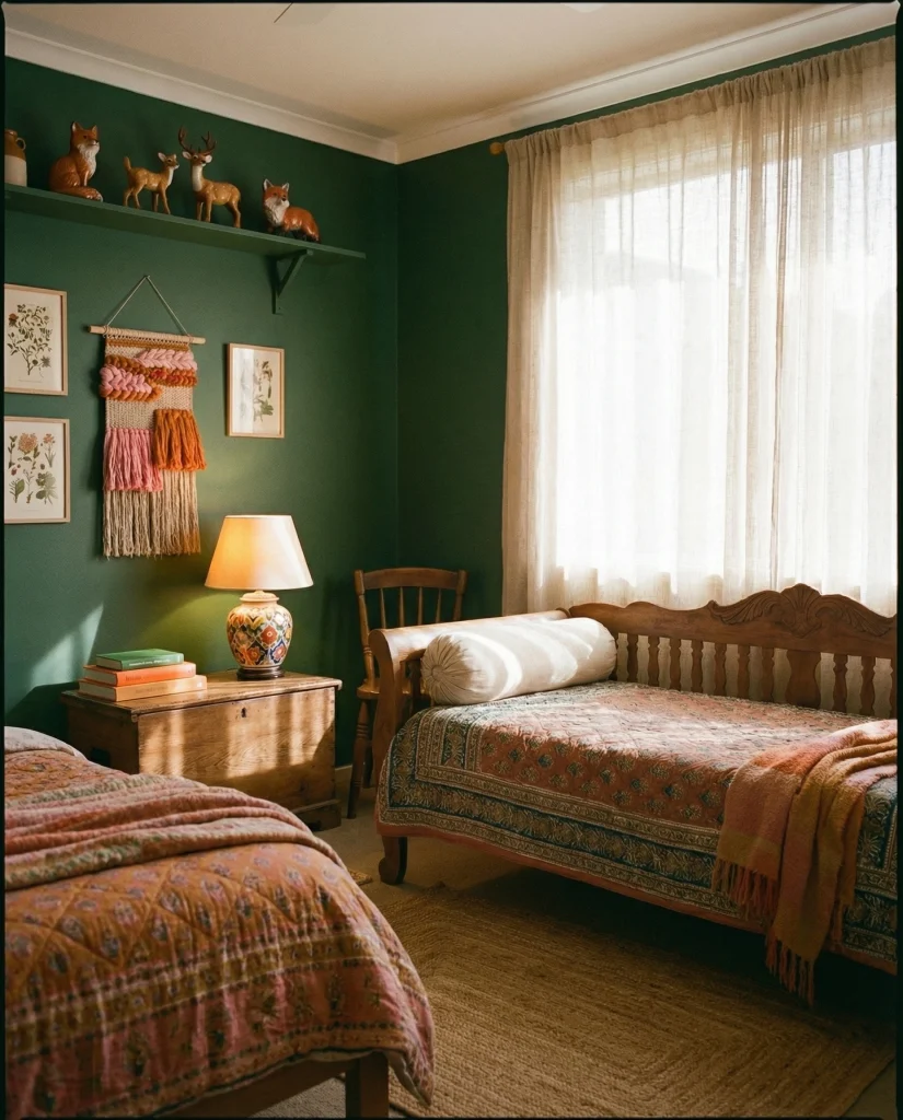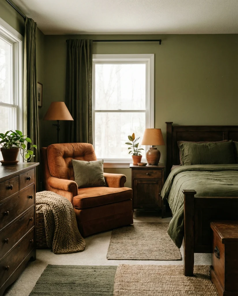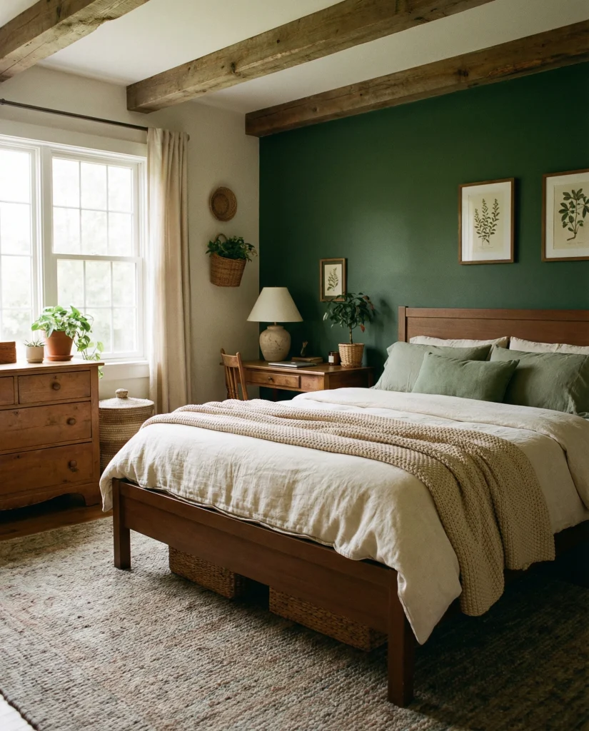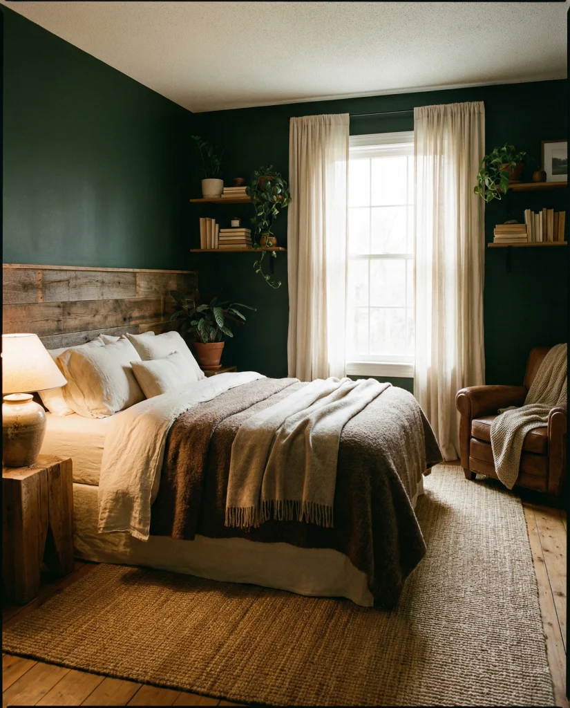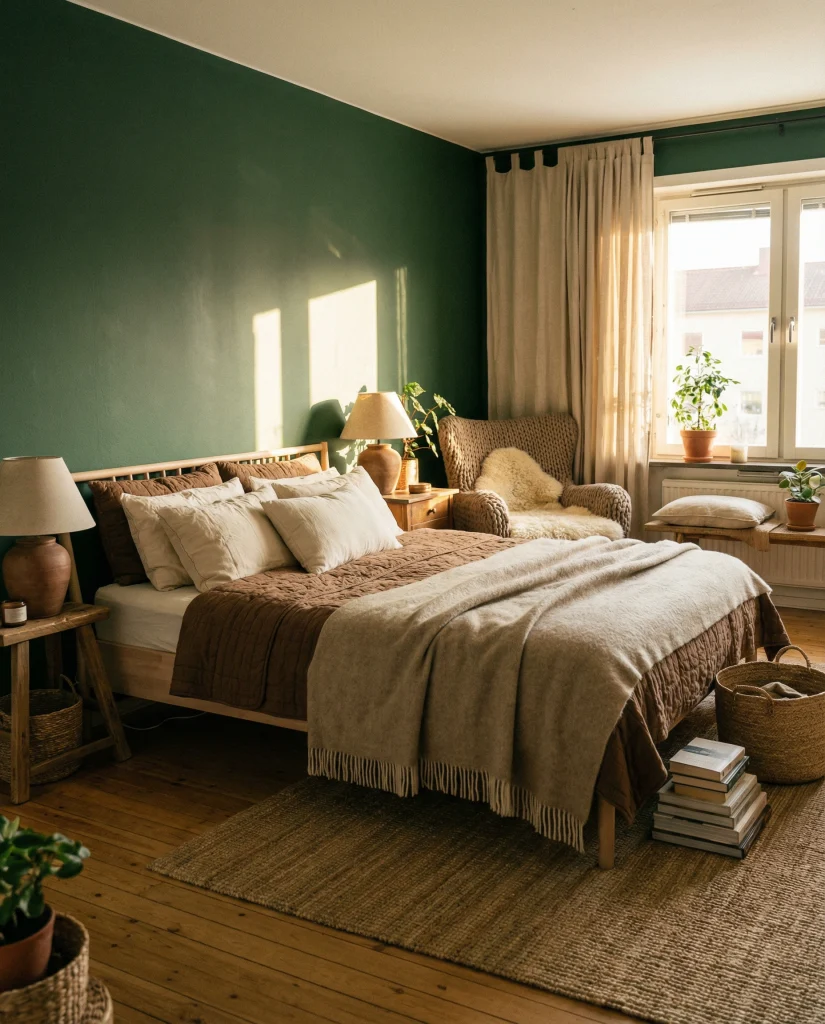 Hunter tones combined with beige, brown, and cream fabrics create a warm, layered look perfect for colder climates. This idea works well in homes with traditional or rustic elements, but it can easily be modernized with sleek nightstands or simple bedding. Hunter green brings depth, while the warm neutrals soften the overall mood, creating a bedroom that feels cocoon-like.