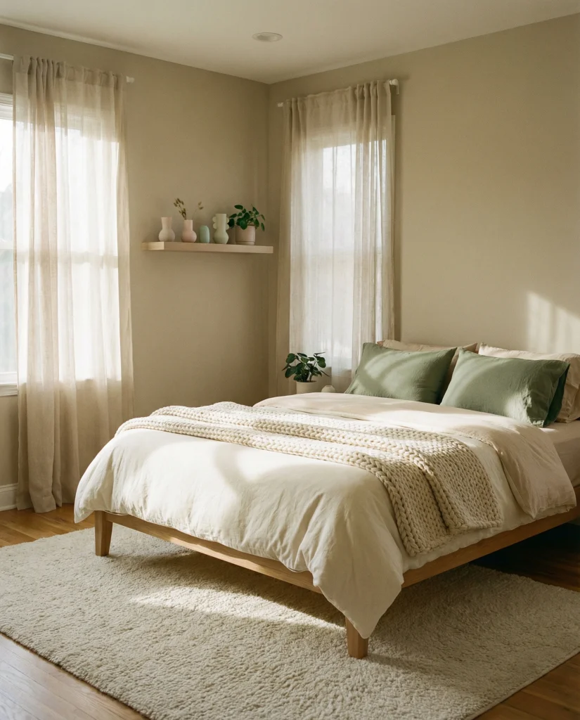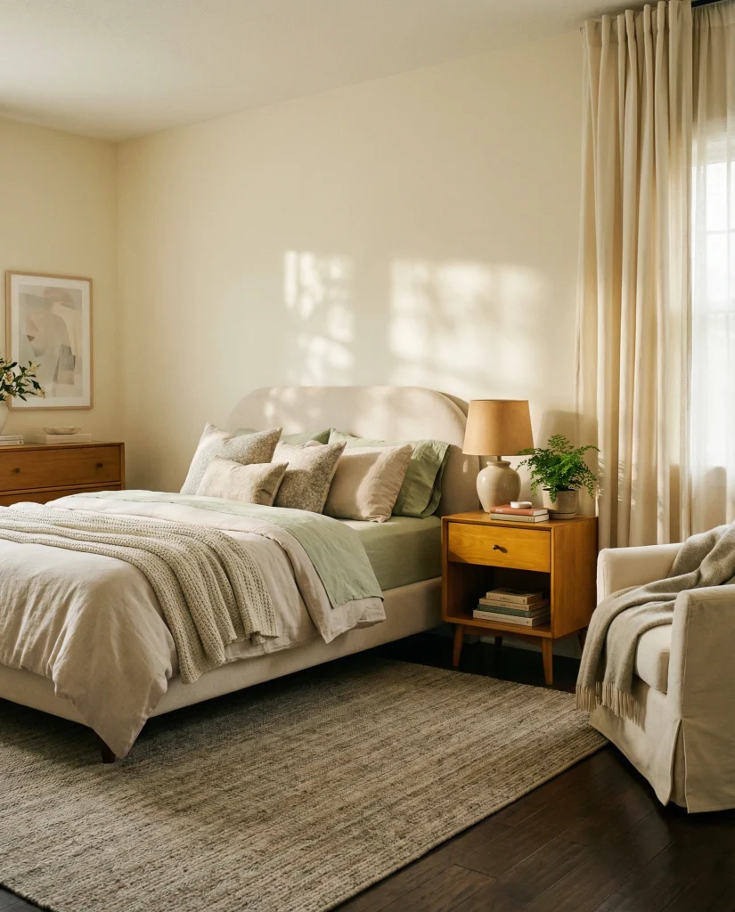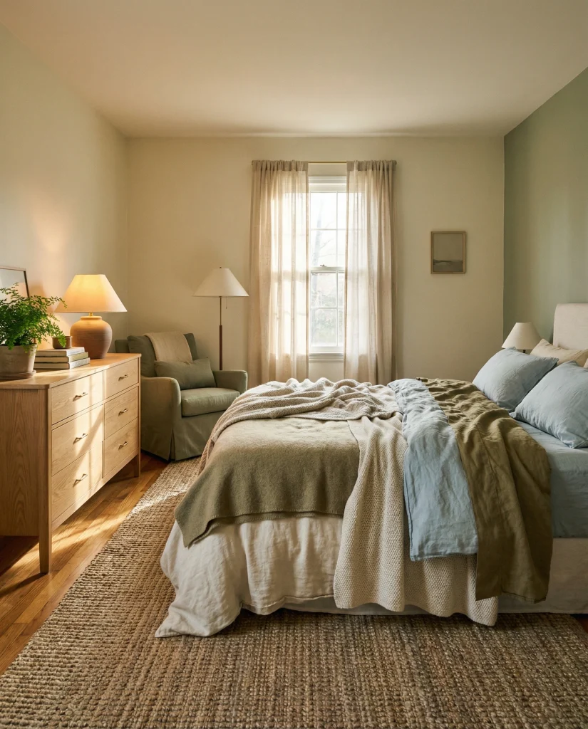 Combining beige and sage, light, pastel, and cream, and details brings a sense of quiet elegance. This idea works well for couples who prefer a neutral bedroom but still want a hint of color. Adding linen bedding or soft lighting enhances the peaceful effect. Many bloggers in the decor space note that sage-neutral blends are becoming the new timeless palette for 2026.