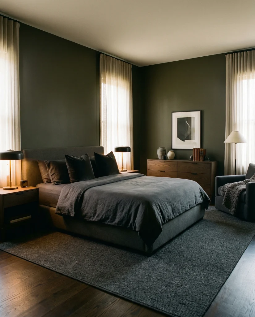 A deep, sophisticated look comes from mixing dark, olive, grey, and black and accents. This palette adds instant refinement, especially when paired with leather details or brushed metal. Dark olive works well in larger bedrooms but can also create a cozy, cocoon-like feel in smaller ones if lighting is strategically placed. Designers appreciate this tone for its ability to stay bold without feeling overwhelming.
