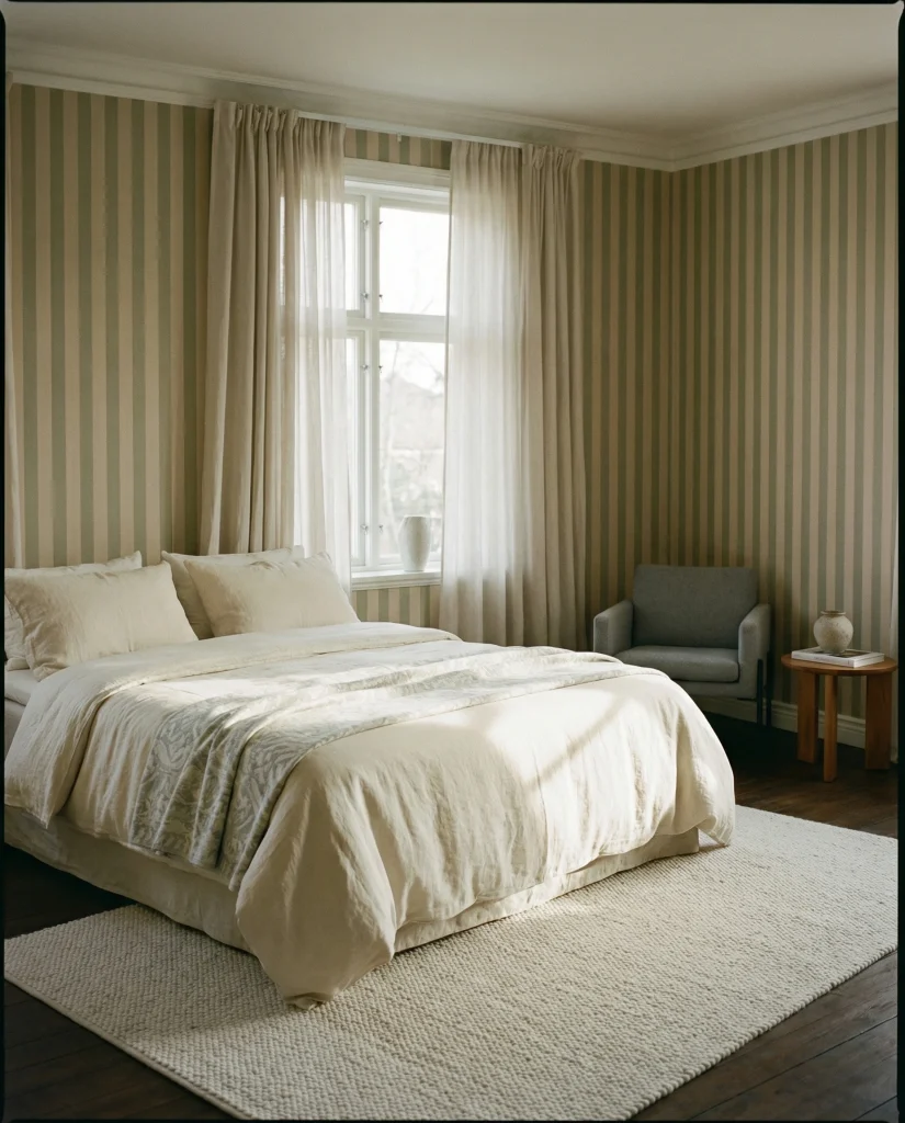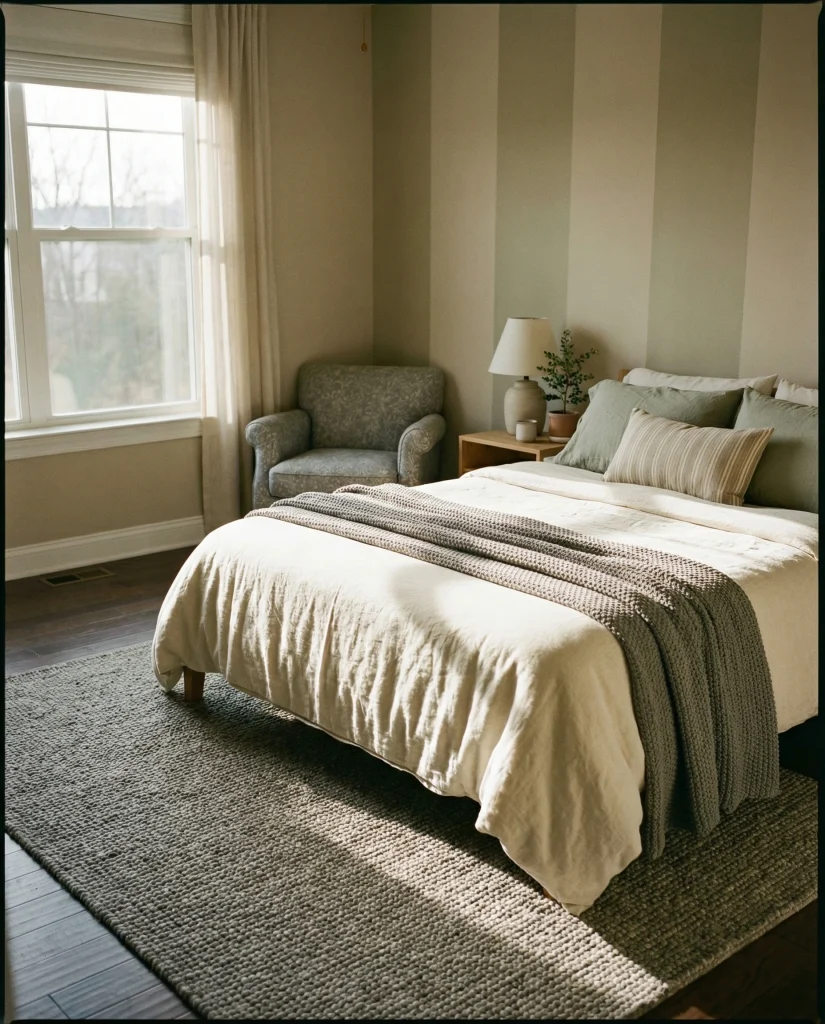 Striped walls in beige and sage, paired with cream and/or gray and accents, add dimension without overwhelming the space. This idea is great for bedrooms that need subtle movement or pattern without becoming busy. Stripes elongate shorter walls and make small rooms look taller. Many designers use this method to bring gentle visual texture into a calm color palette.
