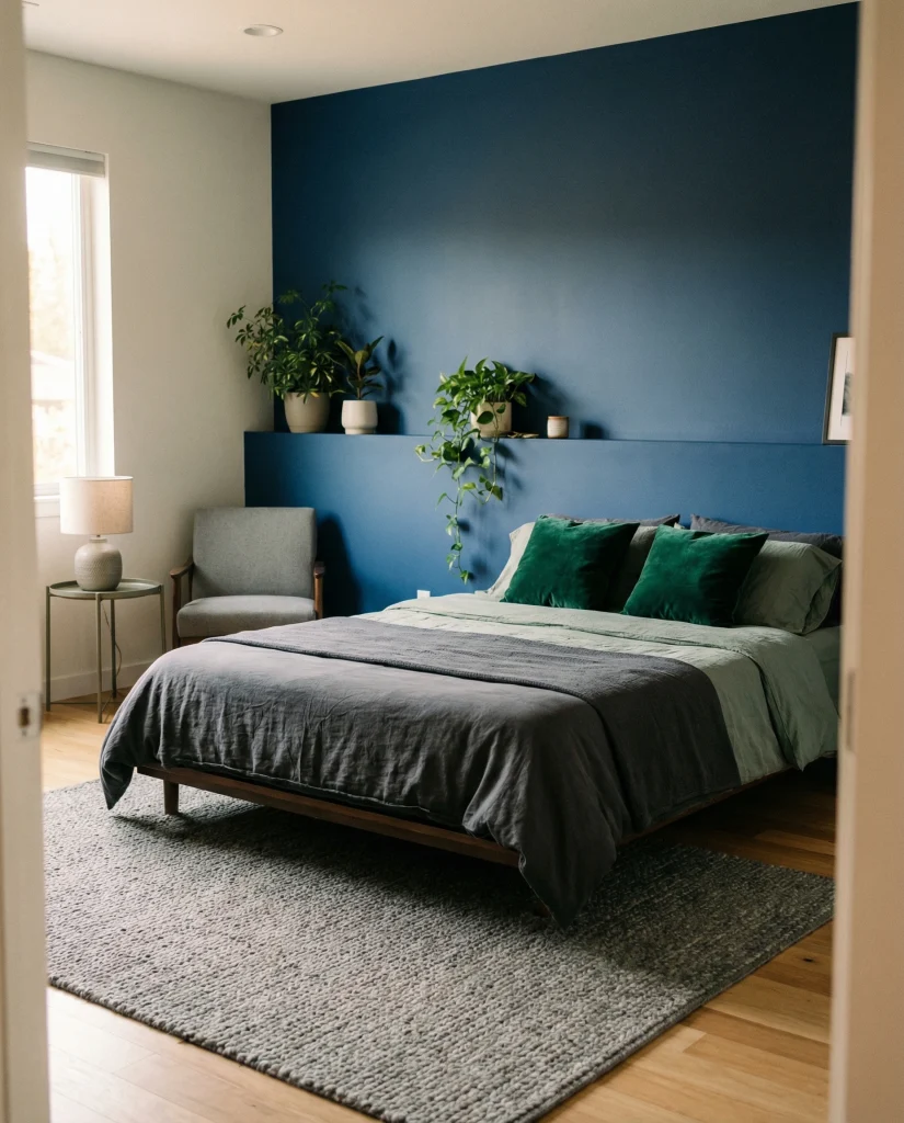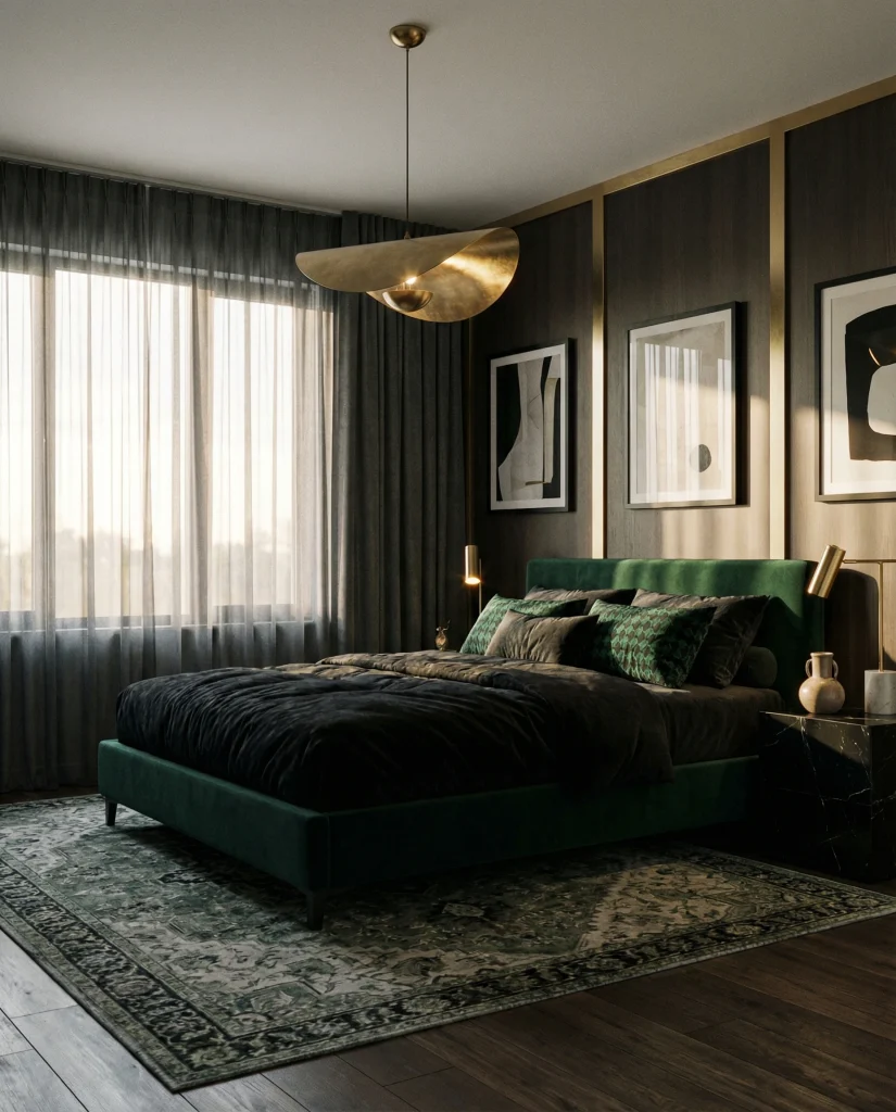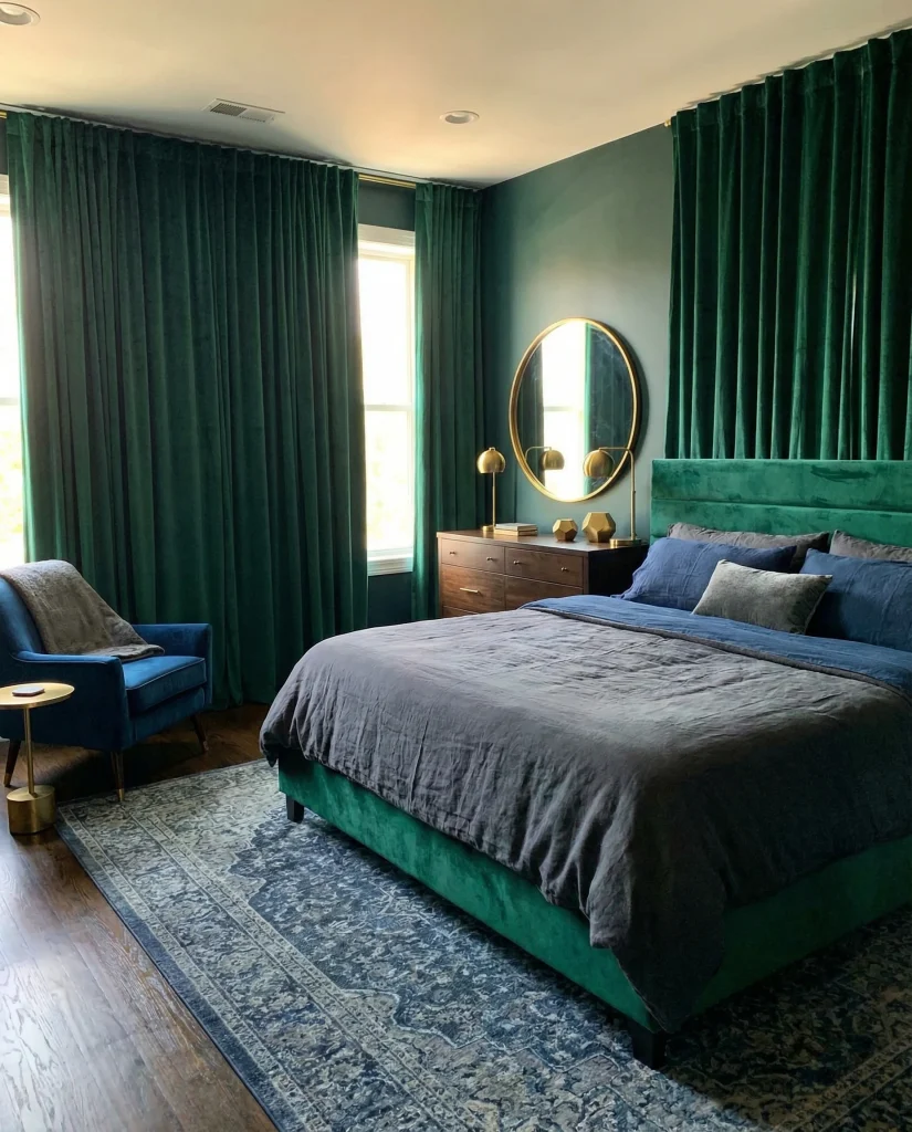 Mixing emerald, black, and grey and metallic accents creates a dramatic, contemporary bedroom. This palette feels luxurious and striking, especially with velvet, silk, or high-contrast furniture. Designers often recommend this idea for people who enjoy bold color but still want a refined, polished space.